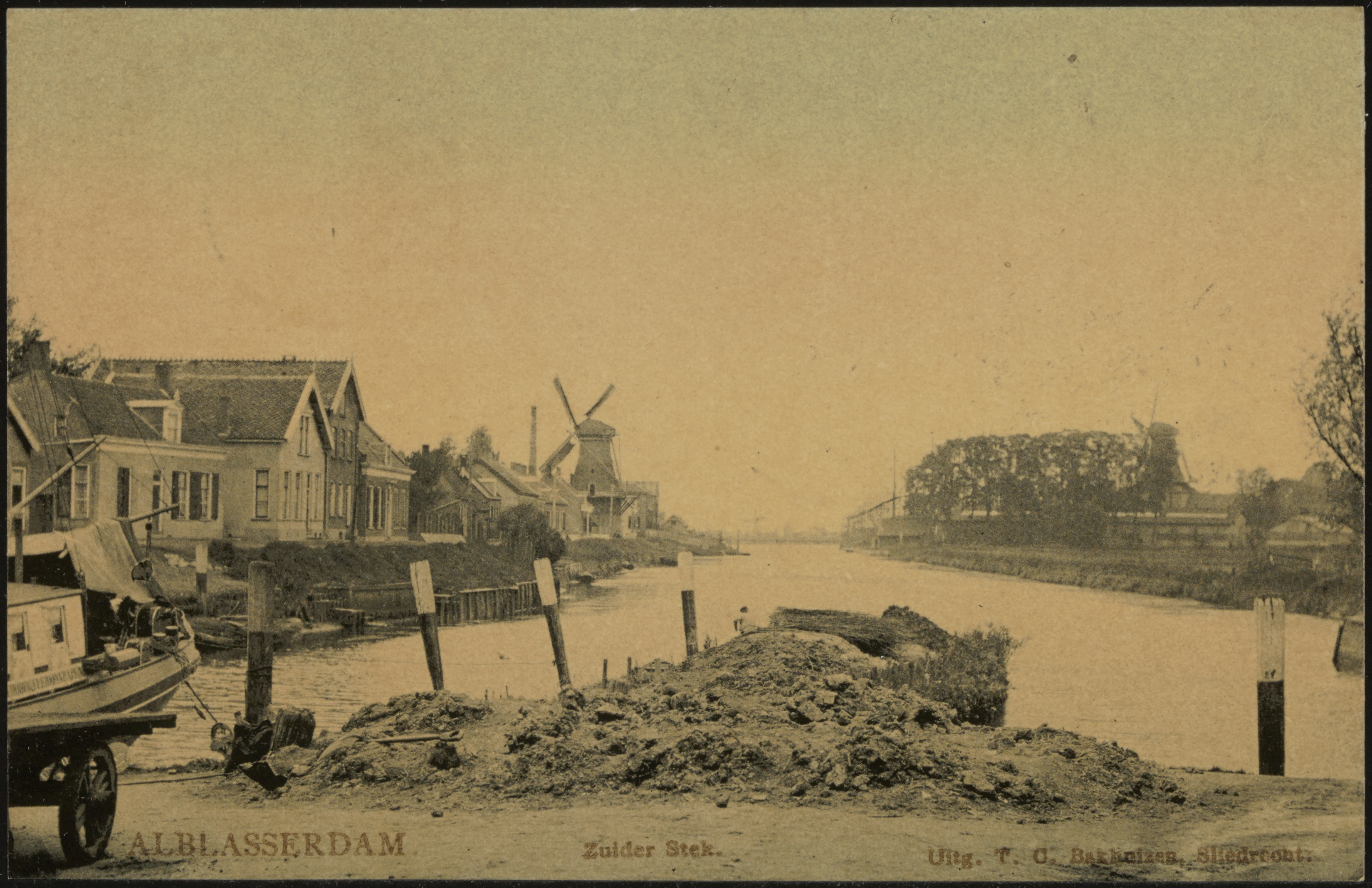 Vanaf de Dam zicht op de buitenhaven met links het Zuiderstek met de korenmolen "De Hoop". Rechts de oude werf met houtzaagmolen "Ons Genoegen" in Alblasserdam.