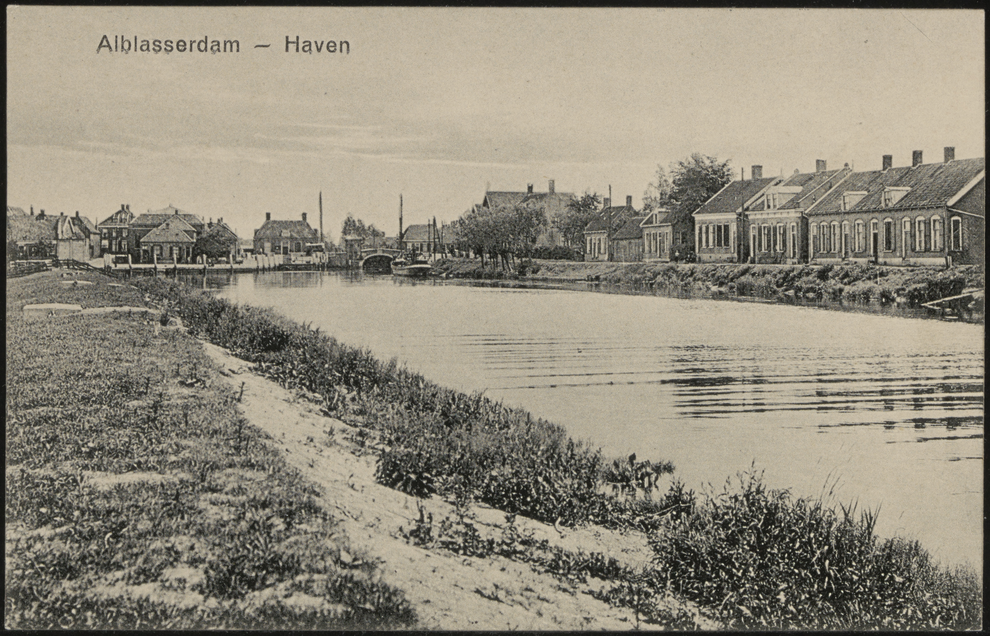 Gezicht op de sluis met rechts Zuiderstek en links het Stoep met het Waardhuis er achter in Alblasserdam.