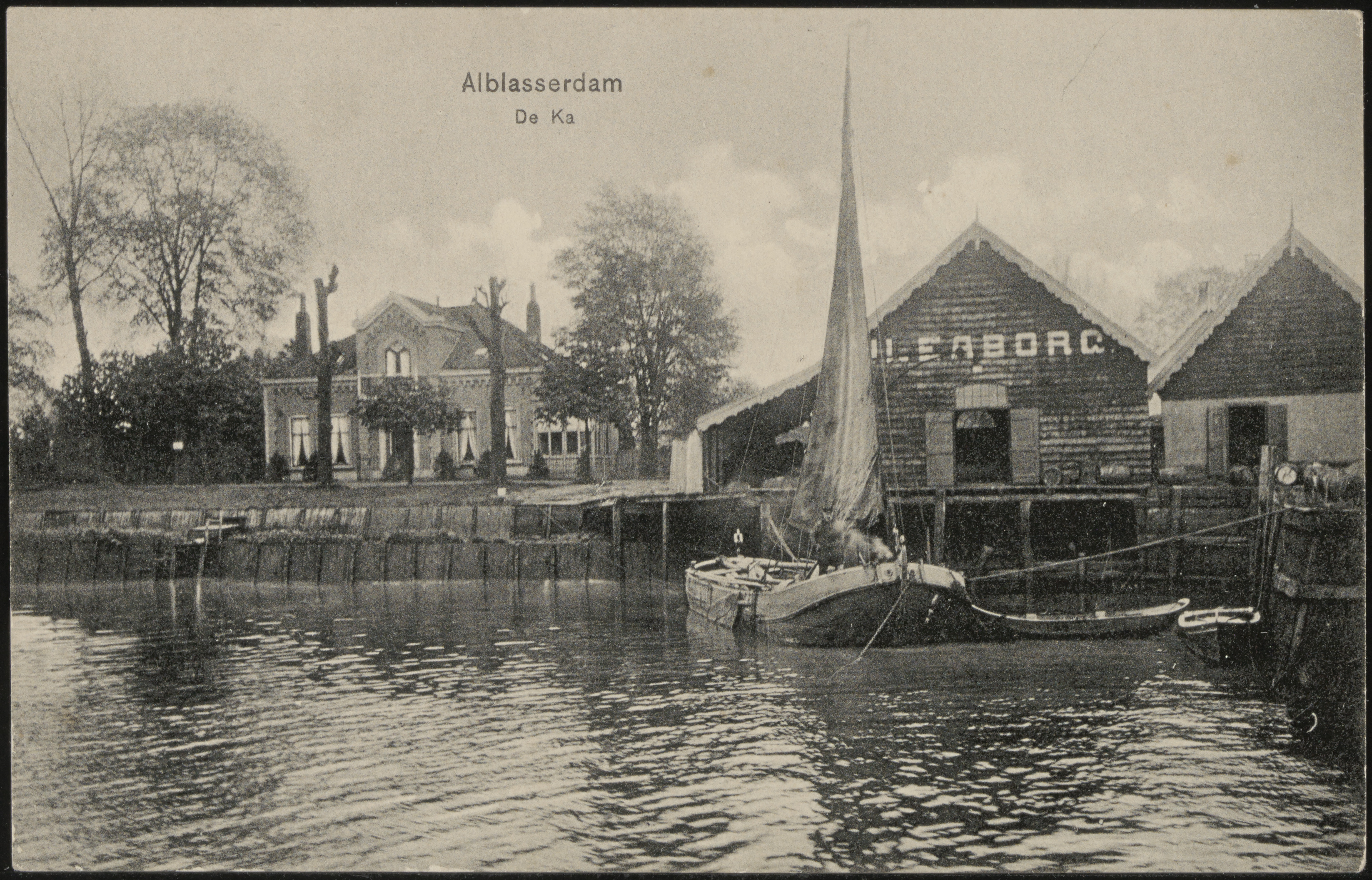 - Links het woonhuis van Vroege aan de Tweede Kade, rechts de twee teerloodsen. Geheel rechts de werf van Vroege in Alblasserdam.