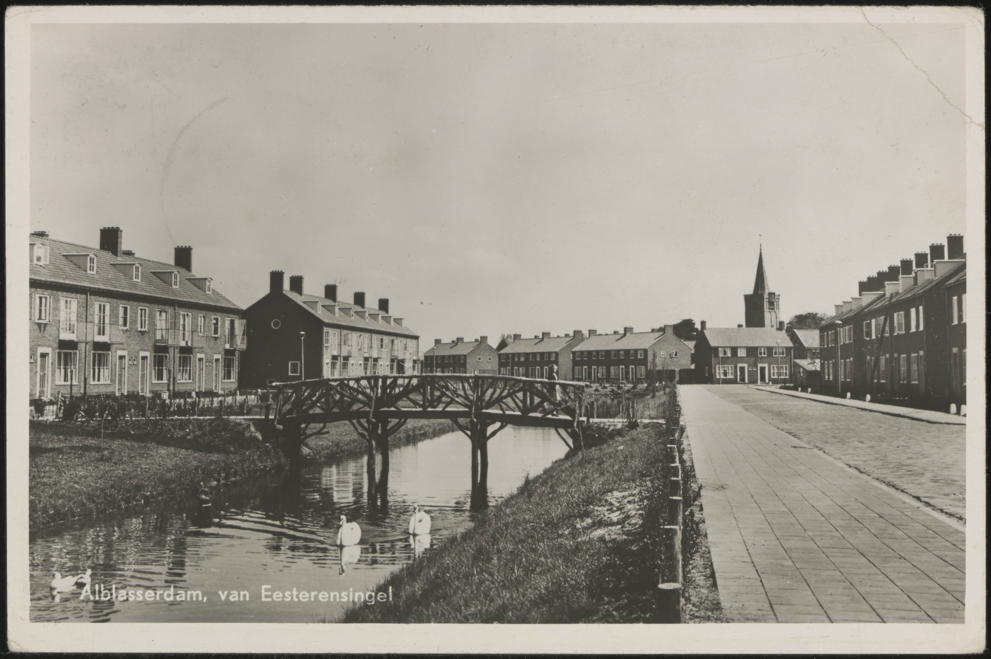 - Van Eesterensingel vanaf de Plantageweg richting Waalsmondelaan met de Oude Toren op de achtergrond in Alblasserdam.