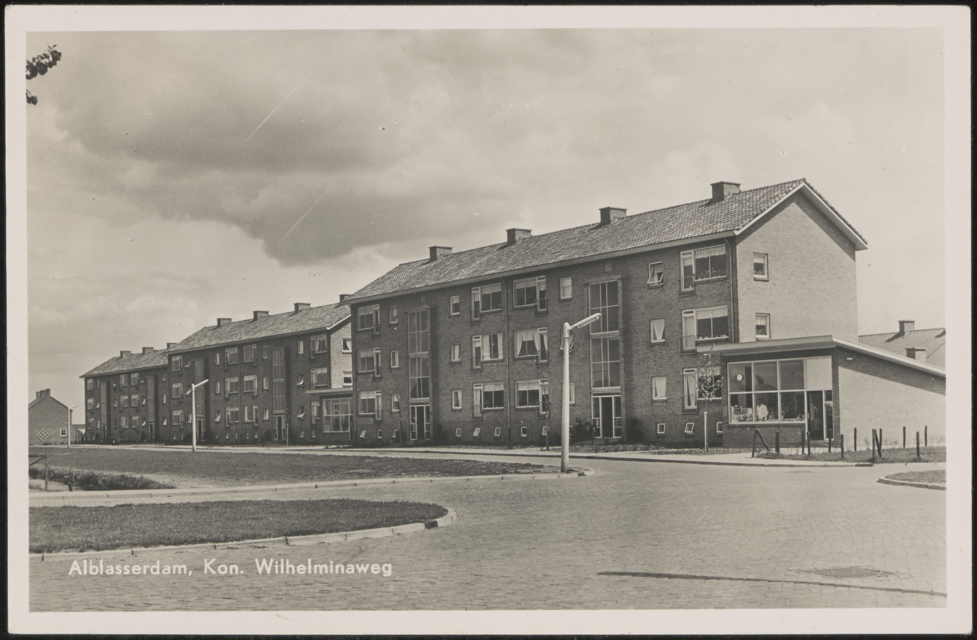 Hoek Randweg/ Kon.Wilhelminaweg met rechts de winkel van slager van den Adel en in het midden melkboer Schenk. (bron HvWA). Alblasserdam.