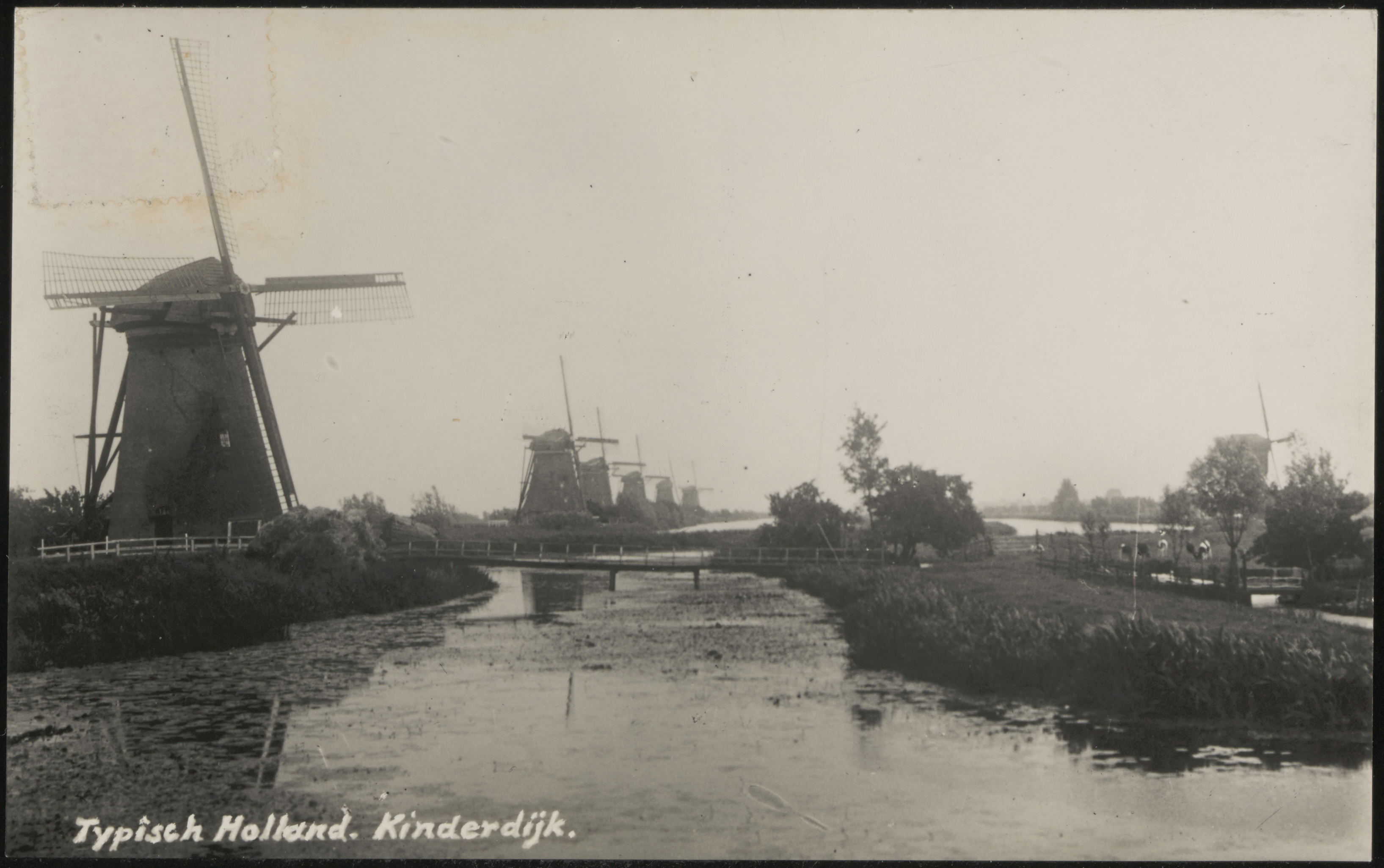 Molens aan de Molenkade Nederwaard in Kinderdijk. Links Molen Nederwaard no. 5.