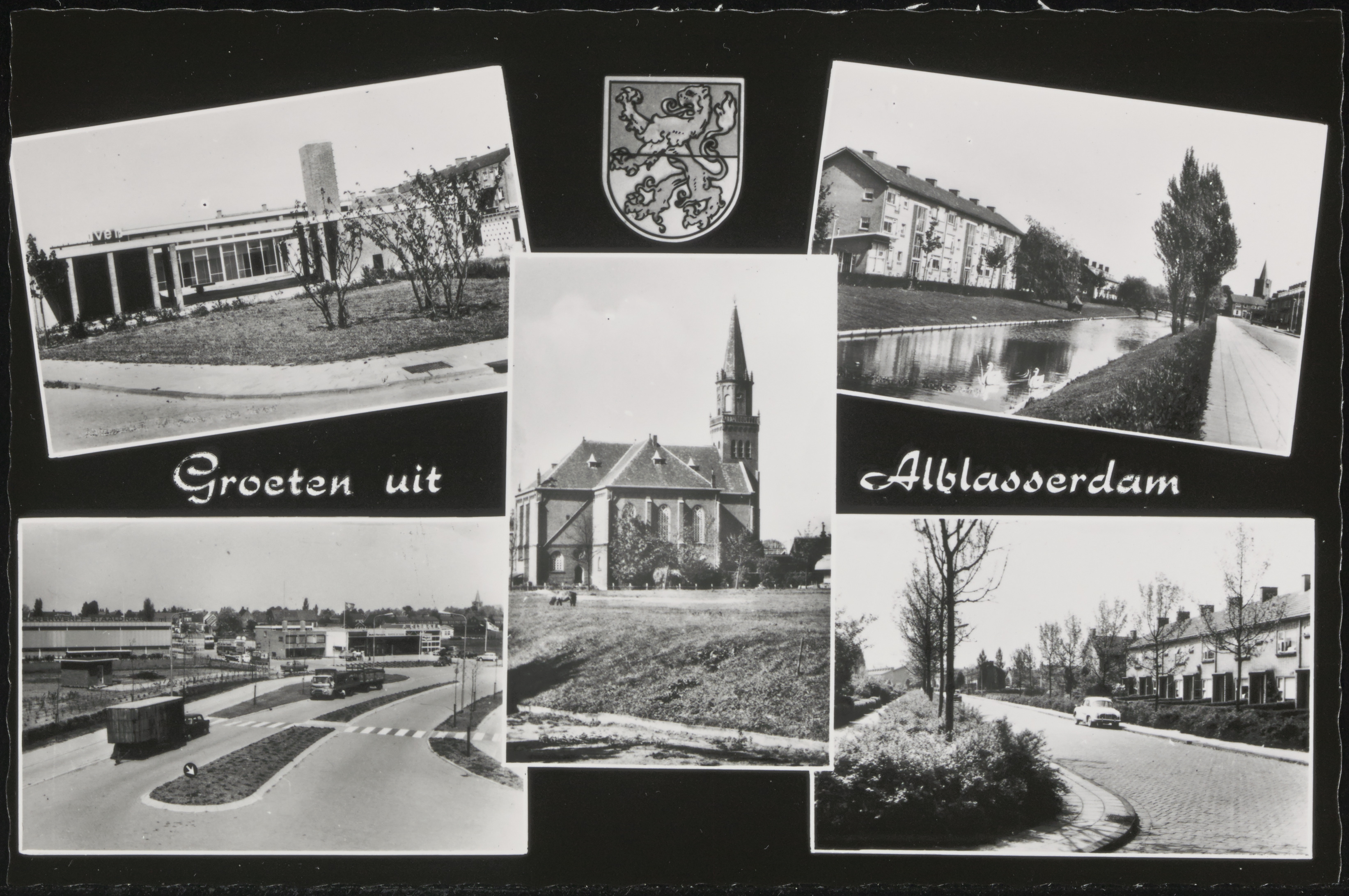 Alblasserdam. Linksboven: Wijkgebouw De Haven aan de Ieplaan. Rechtsboven: Van …