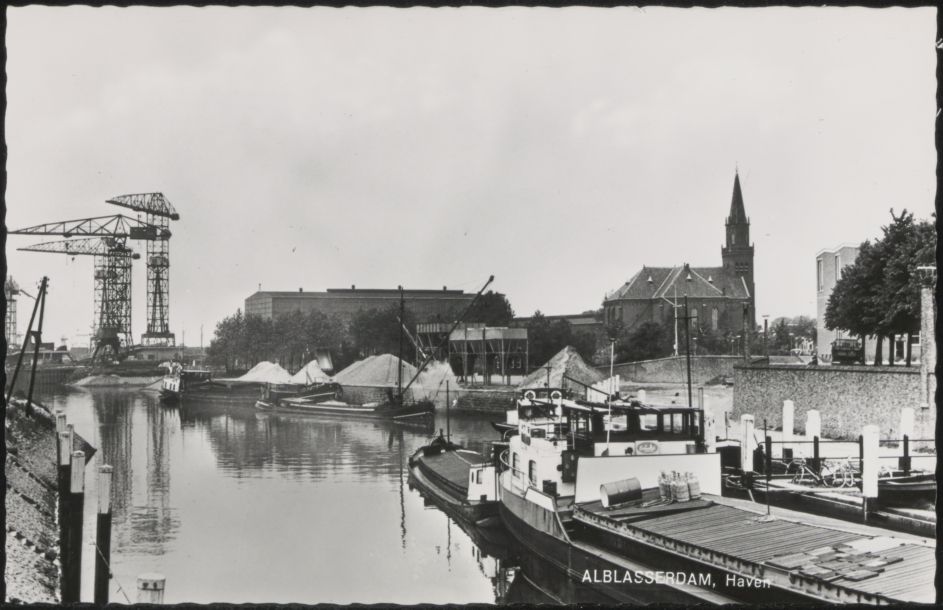 - Buitenachthaven in Alblasserdam gezien richting de scheepswerf van Verolme en de Grote Kerk.
