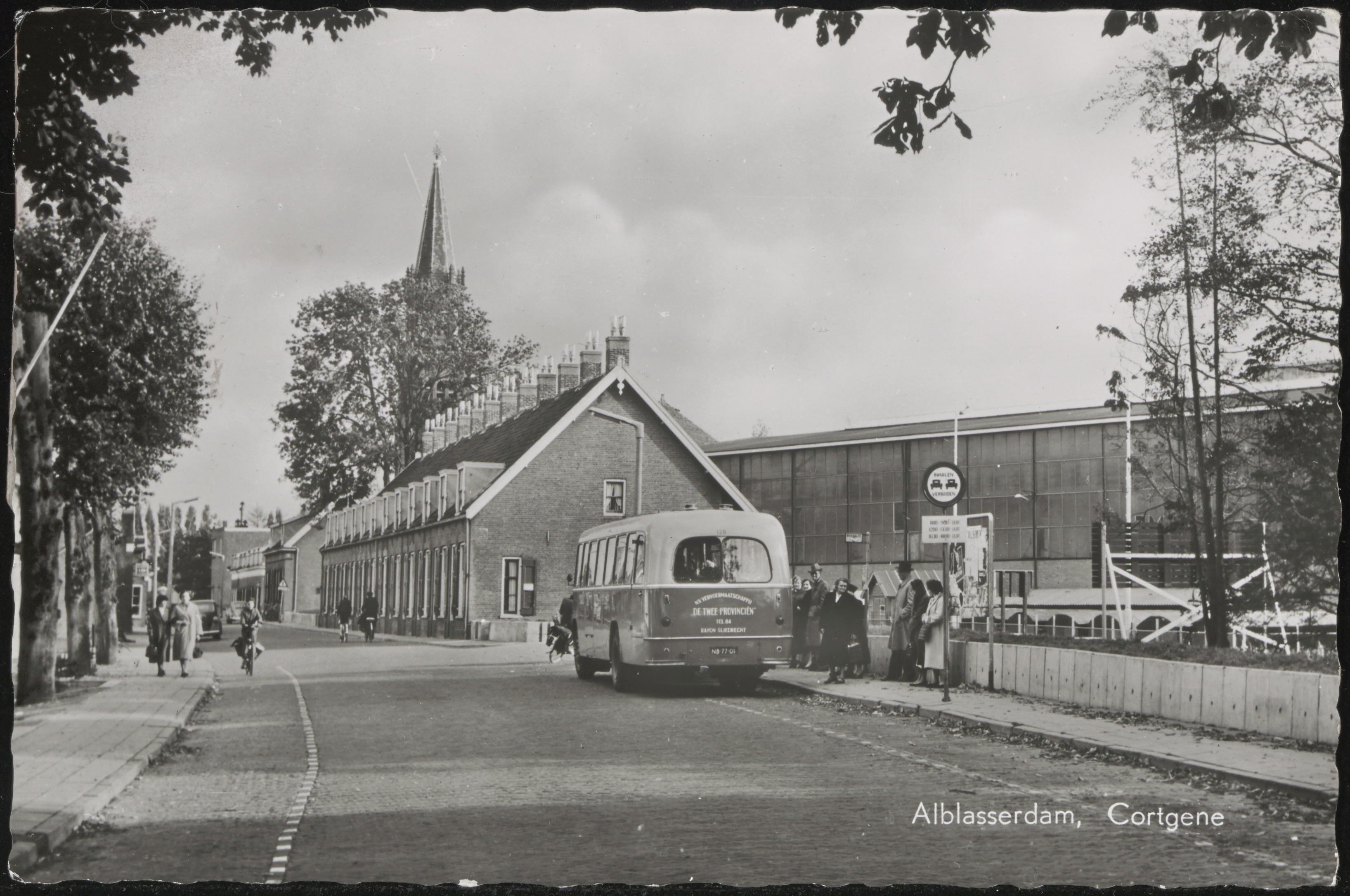 - Rechts de arbeiderswoningen van personeel van "de oude Werf" aan het Cortgene in Alblasserdam. De Grote Kerk op de achtergrond.
