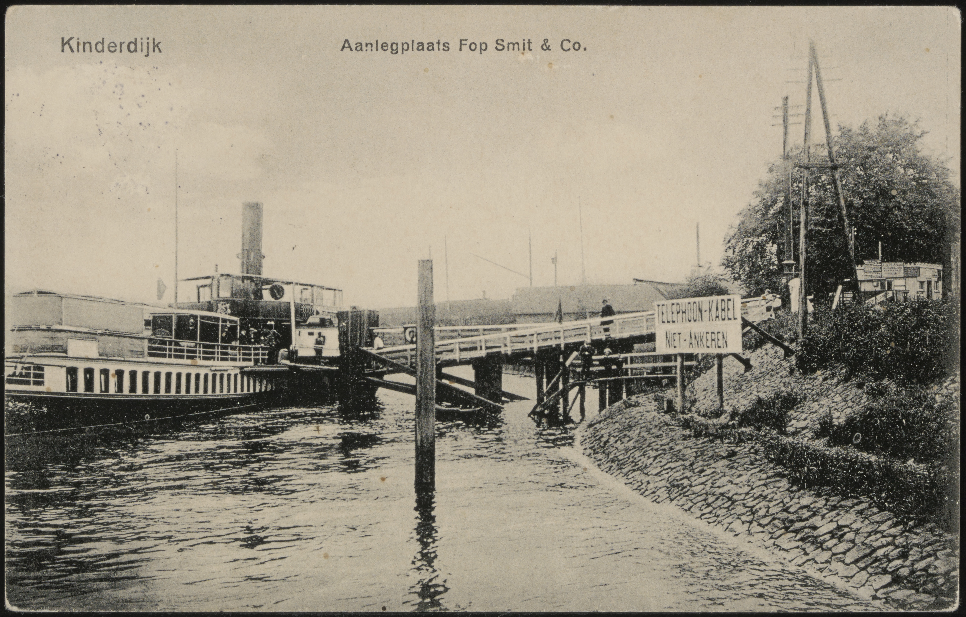 - Aanlegsteiger en veerboot van rederij Fop Smit aan de West Kinderdijk in Alblasserdam.