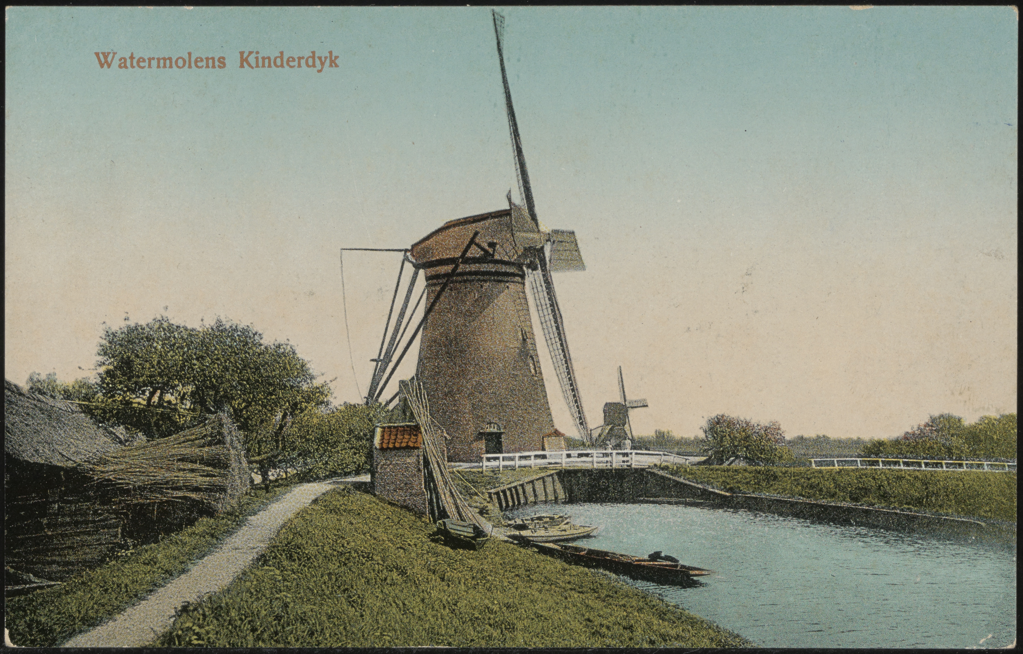 - Molen Nederwaard no. 5 aan de Molenkade Nederwaard in Kinderdijk. Op de achtergrond museummolen Blokweer in Alblasserdam.
