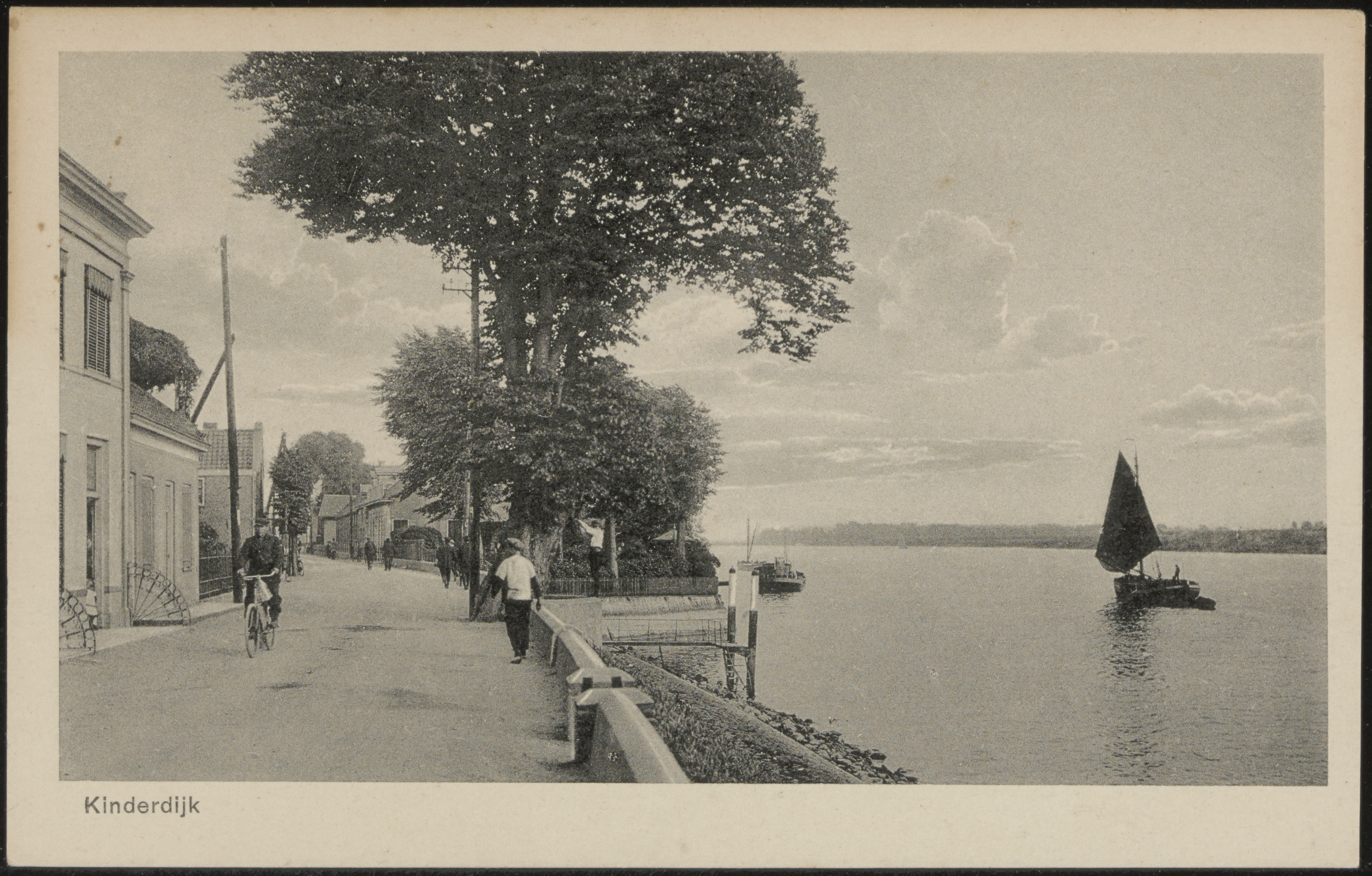 De West Kinderdijk langs de Noord in Alblasserdam. Rechts de aanlegsteiger van rederij …