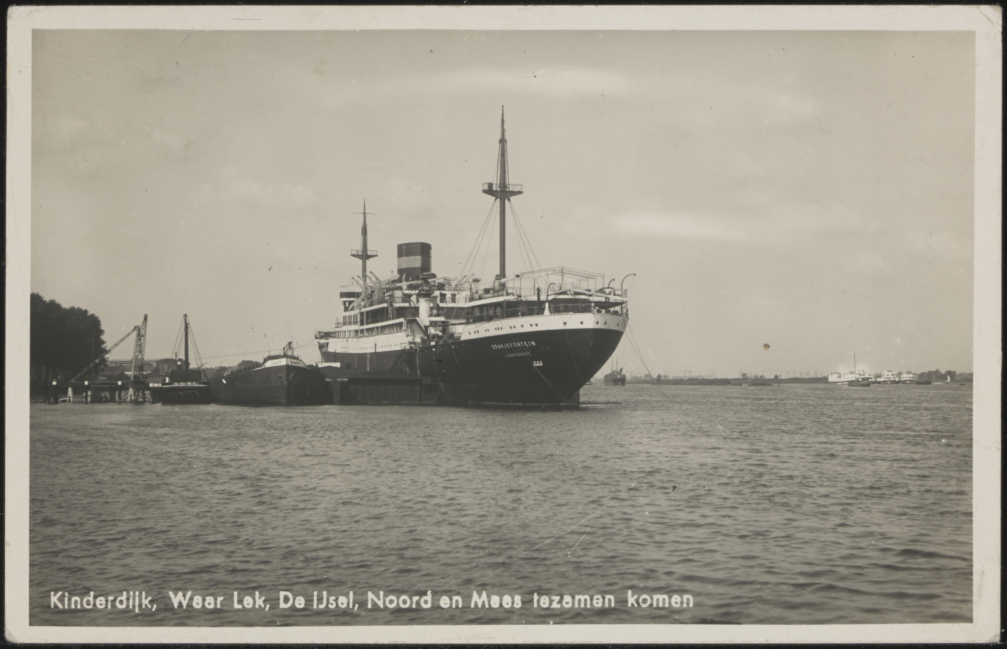- Rivierenknooppunt van Noord, Lek en Nieuwe Maas. Links scheepswerf Smit in Kinderdijk. Het passagiers- en vrachtschip Oranjefontein ligt afgemeerd.