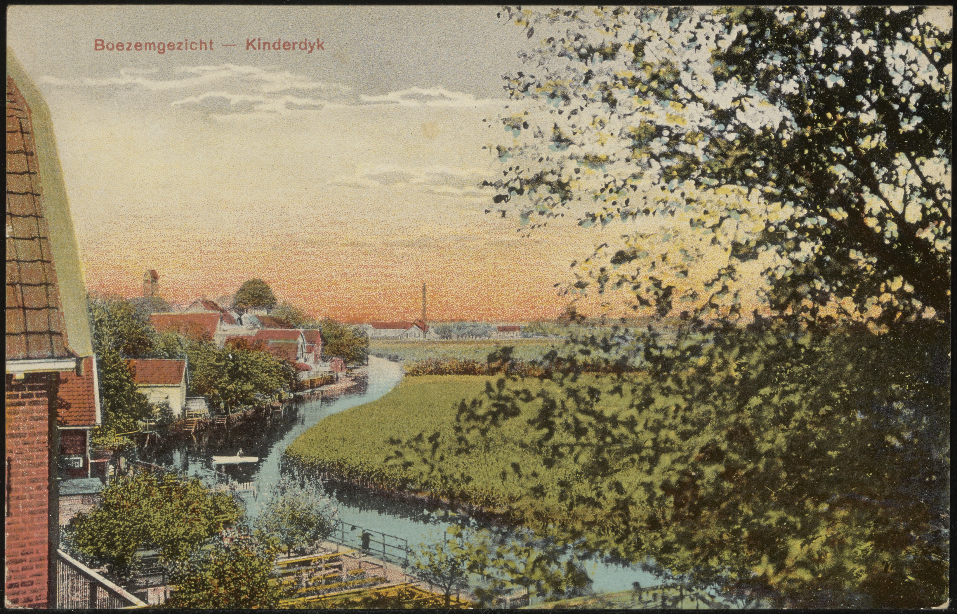 Vanaf de Molenstraat zicht op de boezem in Kinderdijk. Op de achtergrond links de Nederlands Hervormde Kerk en in het midden (met pijp) het gemaal Van Haaften.