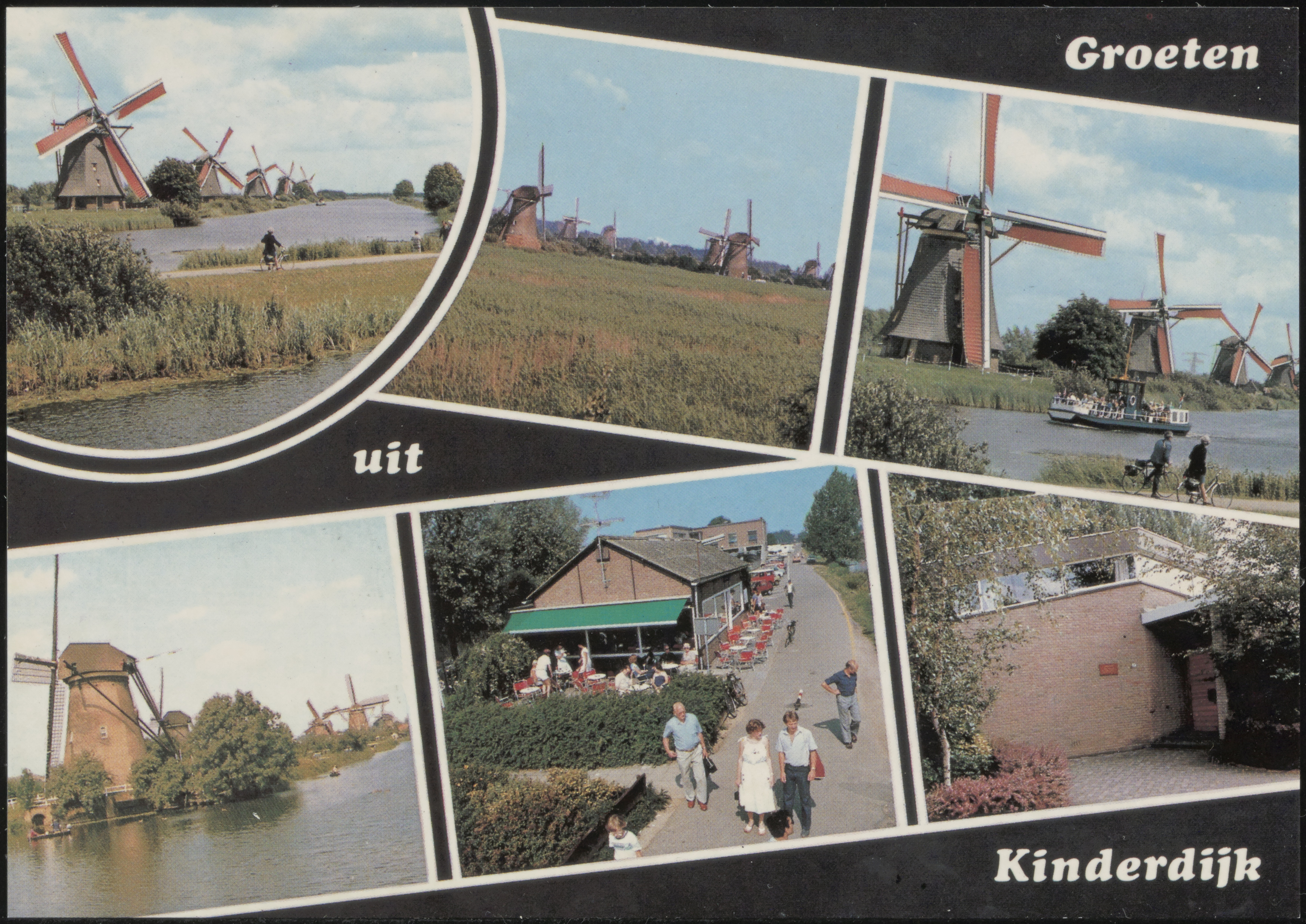 - Molens in Kinderdijk en een souvenirwinkel aan de Molenkade Nederwaard.