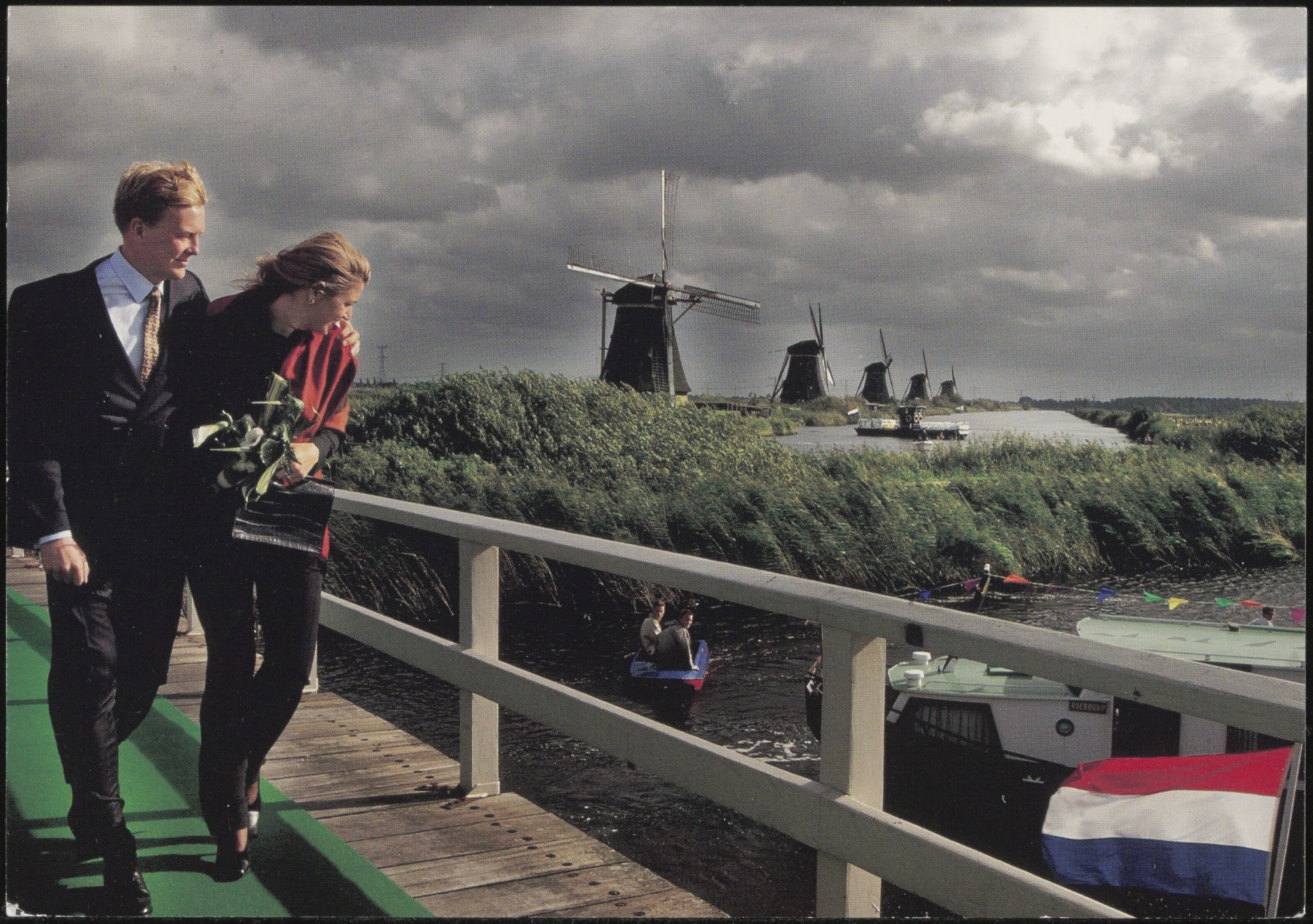 - Willem-Alexander en Maxima op de brug tussen Molenkade Nederwaard en Blokweerschekade.bij de molens in Kinderdijk.