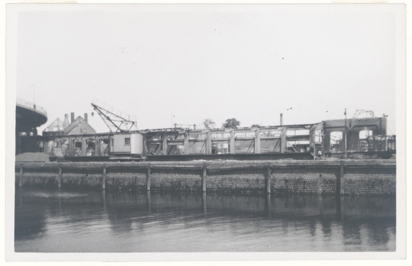- Door beschietingen in mei 1940 beschadigde goederenloods aan de Spoorweghaven.