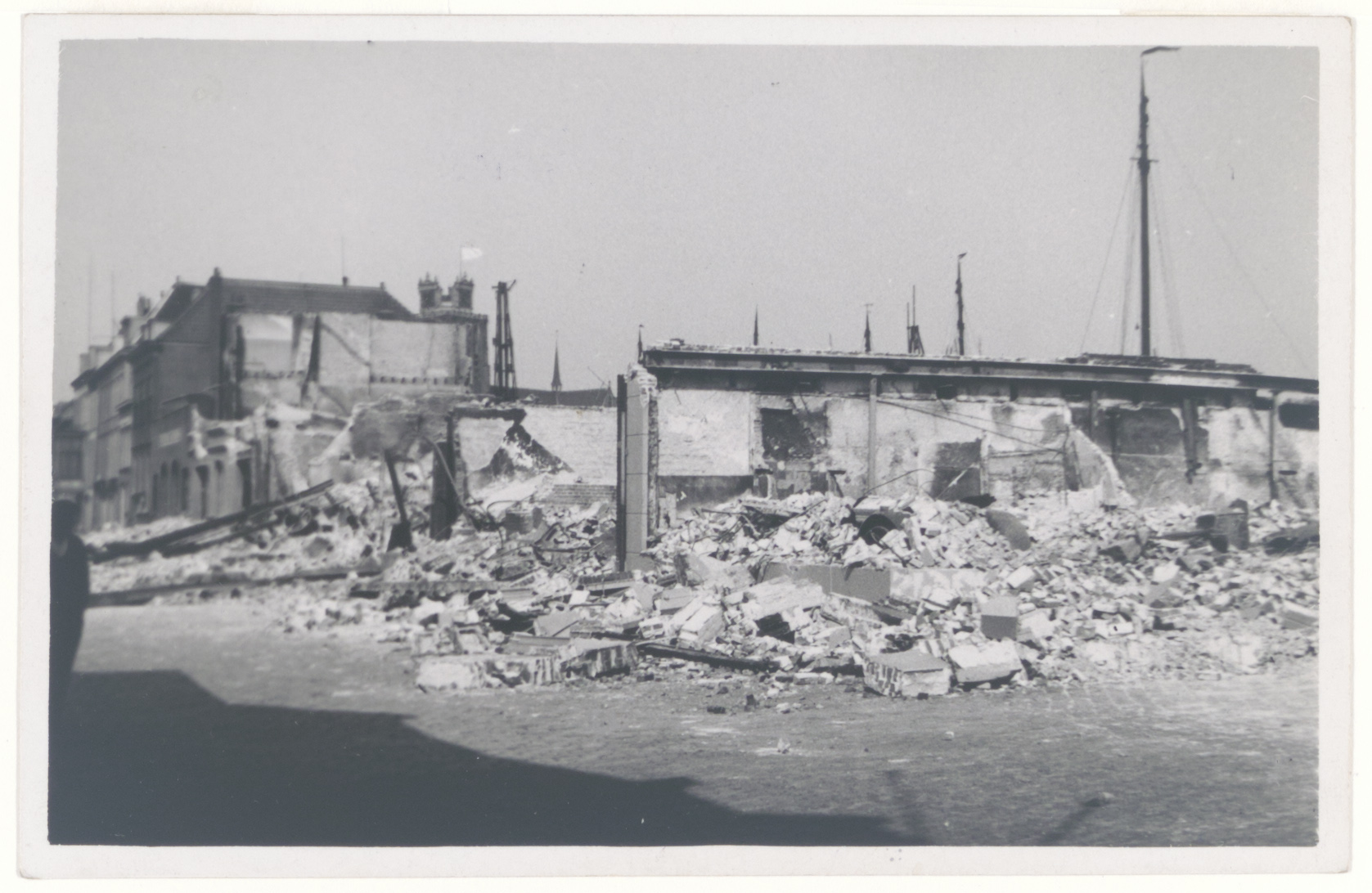 - Door beschietingen in mei 1940 beschadigde bebouwing aan de Buiten Kalkhaven, gezien in noordoostelijke richting.