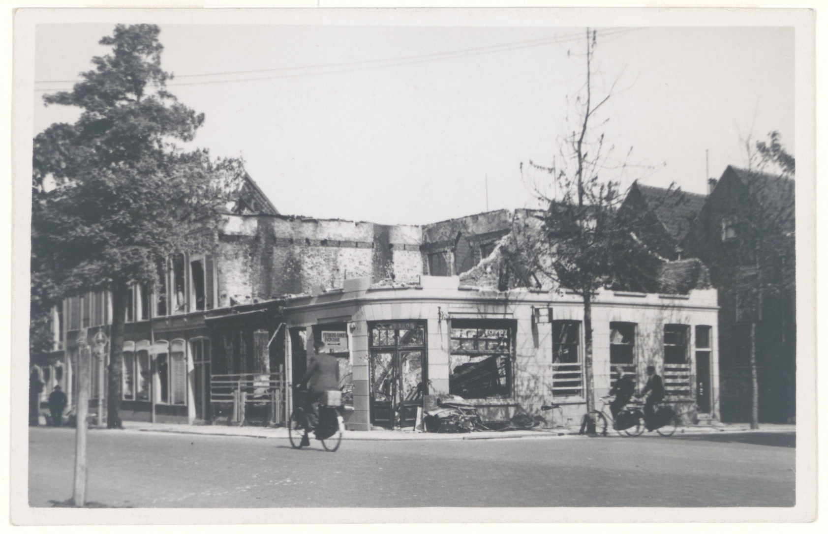 Oorlogsschade aan het pand van Du Parant aan de Albert Cuypsingel hoek Beverwijckstraat.