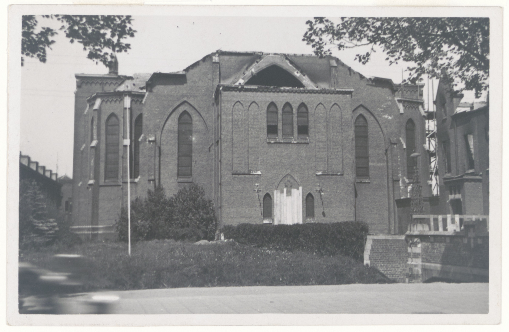 - Door beschietingen beschadigde R.K. kerk en pastorie (rechts) aan de Burgemeester de Raadtsingel tijdens de meidagen in 1940.