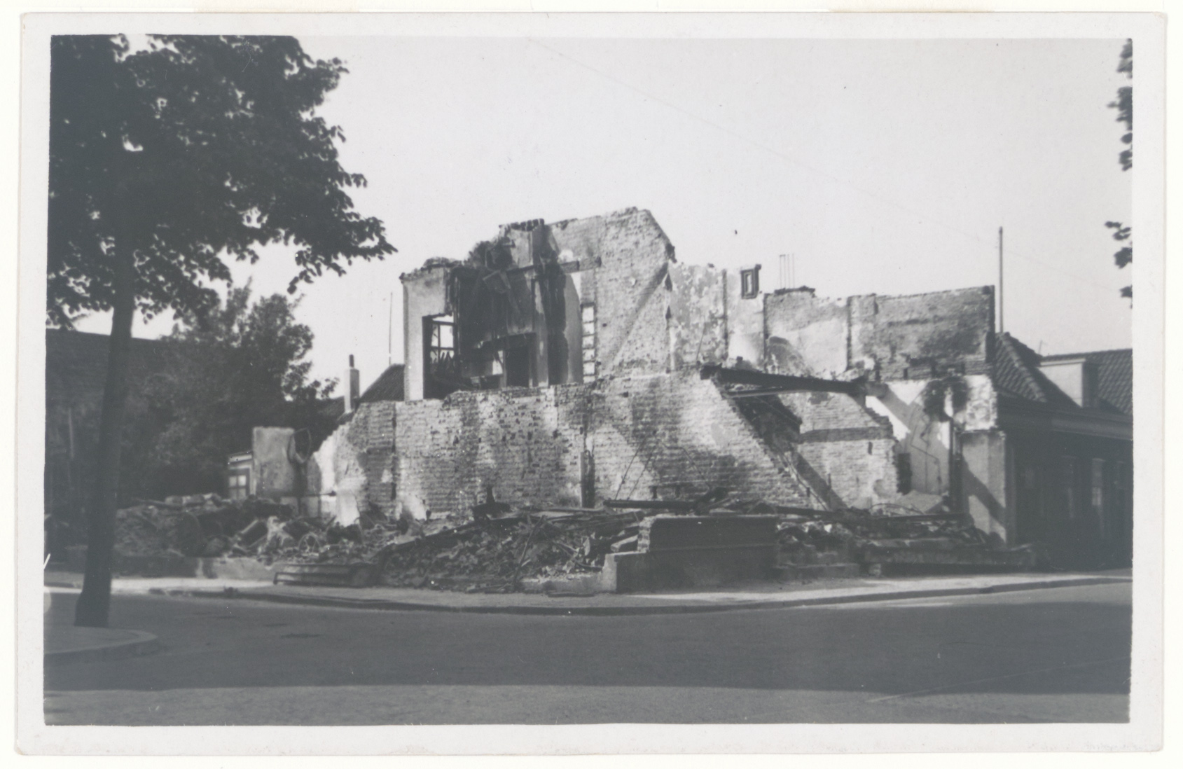 Vernielde drukkerij en een Coöp-winkel in de Toulonselaan (nummers 70-72) hoek De la Reijstraat (links) door oorlogsgeweld in de meidagen van 1940.