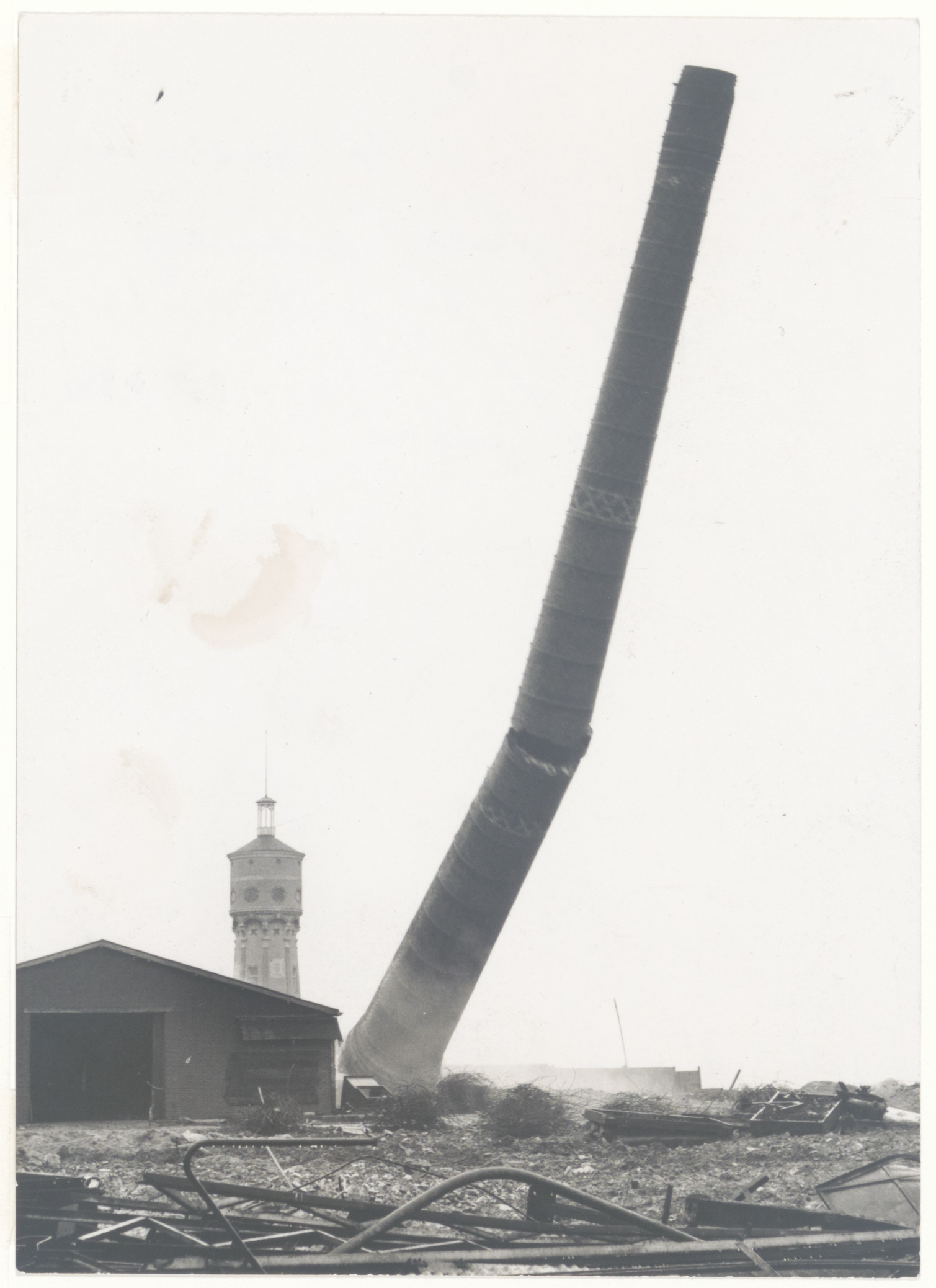 - Sloop van de schoorsteen van zoutziederij J. de Bondt in Zwijndrecht. Op de achtergrond de watertoren.