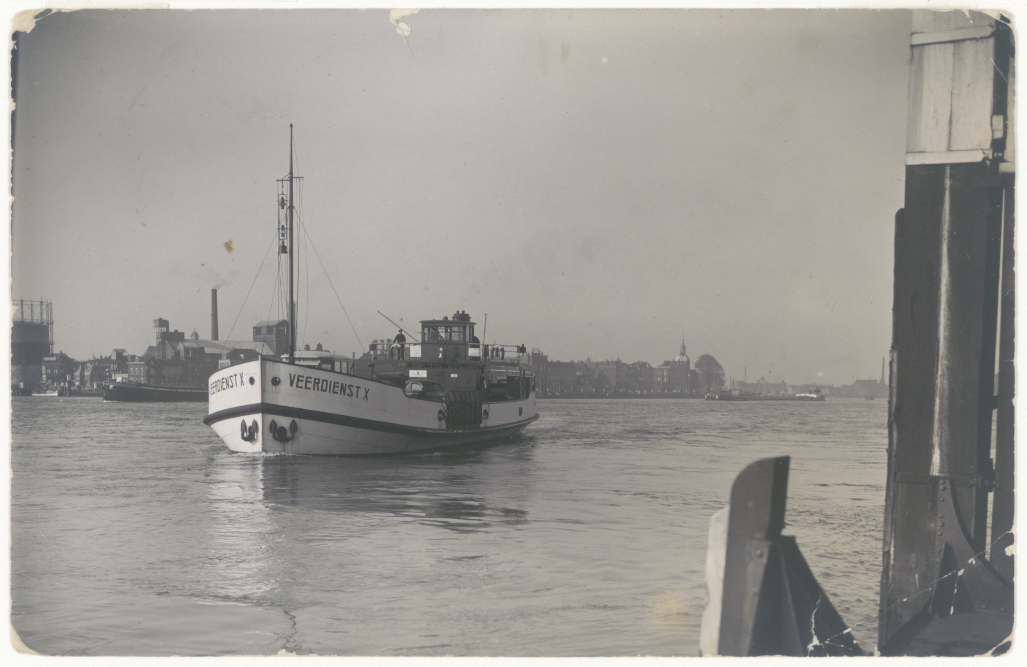 - Veerdienst X onderhoudt op de Merwede de verbinding tussen Dordrecht en Papendrecht. Links een gashouder aan de Bleijenhoek en de gasfabriek aan de Merwekade.