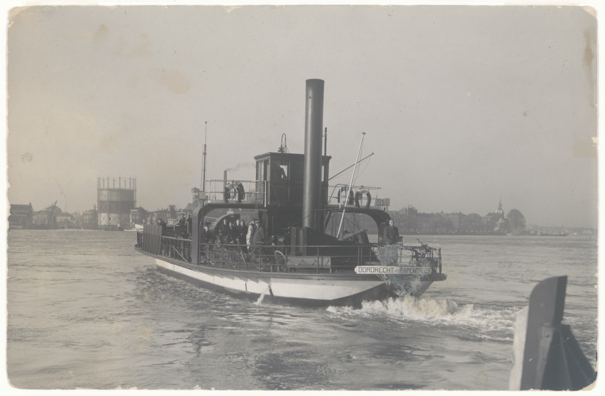 - Veerboor op de Merwede gaat van Papendrecht naar Dordrecht. Rechts de Merwekade. De gashouder staat aan de Bleijenhoek.