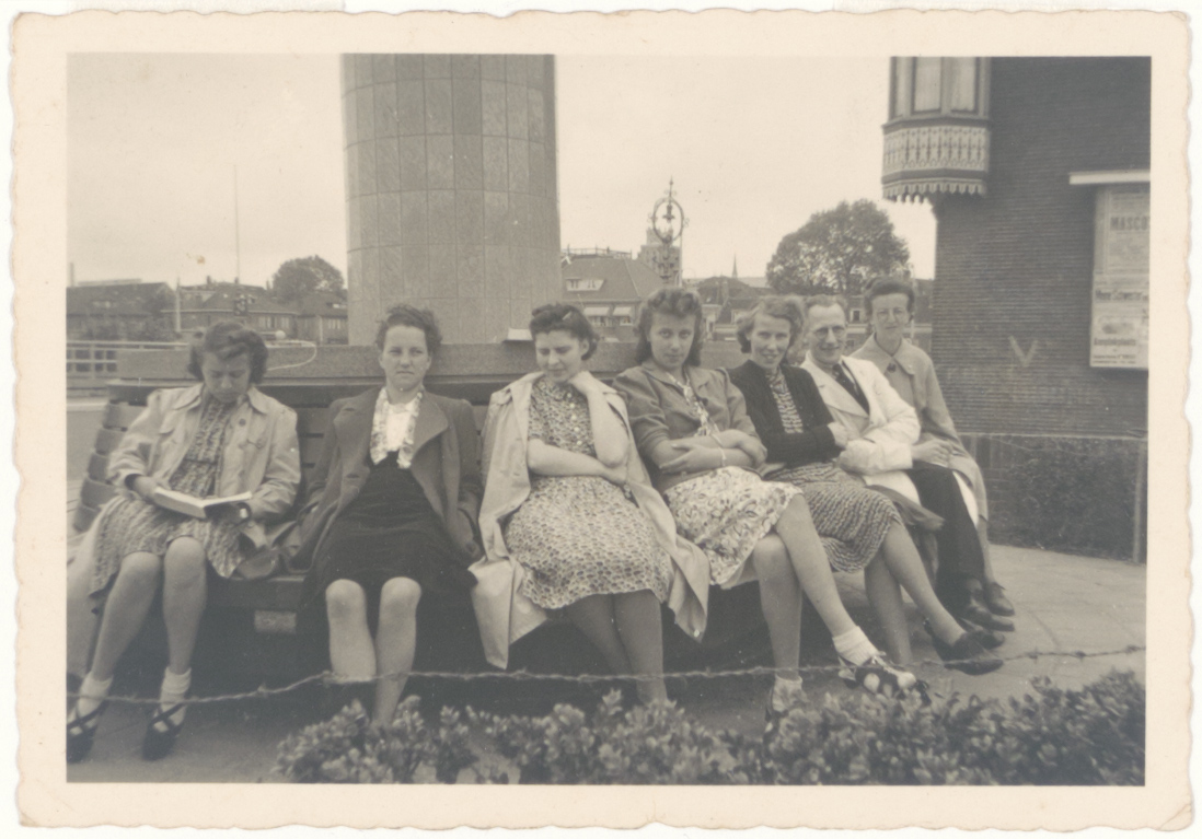 - Een groep collega's van de Ardath sigarettenfabriek tijdens een pauze op de hoek van de Burgemeester de Raadtsingel en de Spuiweg.