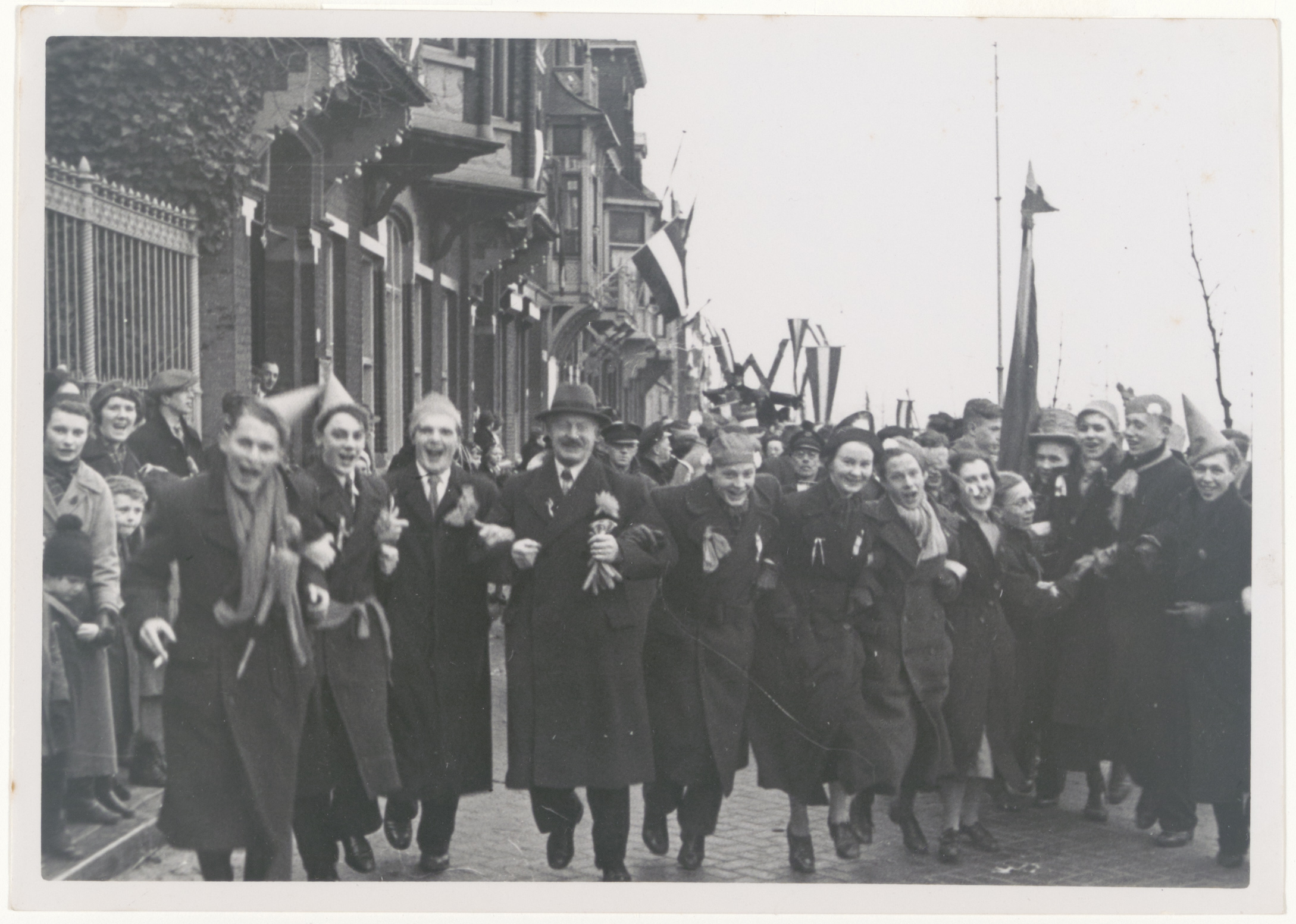 - Feestende burgers op de Buiten Walevest bij de geboorte van prinses Beatrix.