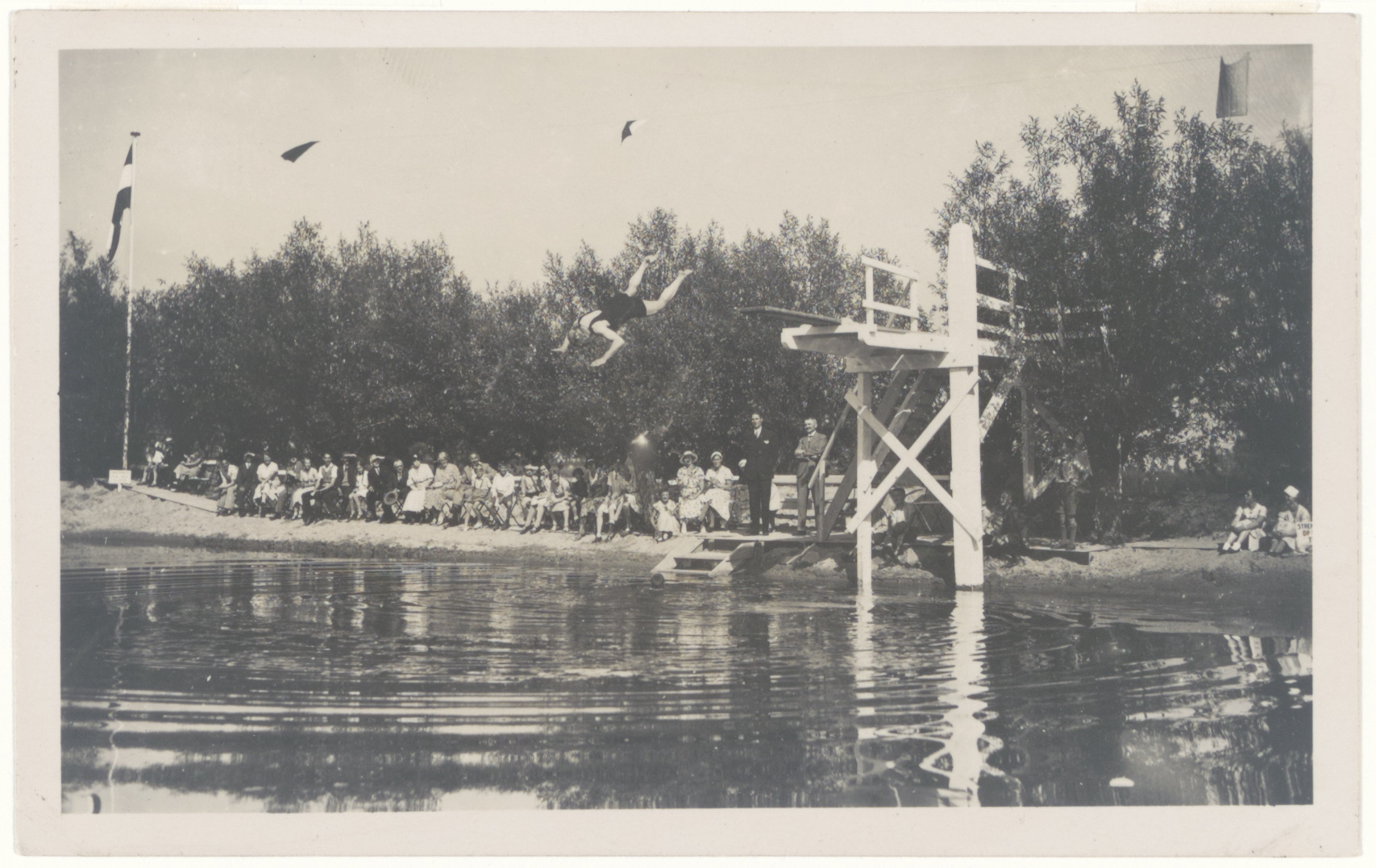 - Wethouder Dicke duikt na zijn zoontje in zwembad De Groene Plas aan de Noordendijk bij de opening van deze inrichting.