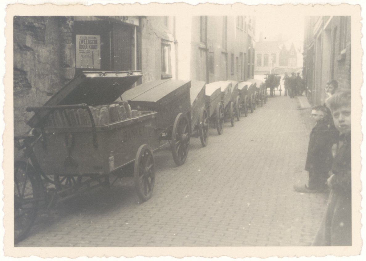 - Bakkerskarren van broodbakkerij De Berenkamp voor het bedrijf in de Nieuwkerkstraat. Op de achtergrond het Nieuwkerksplein.