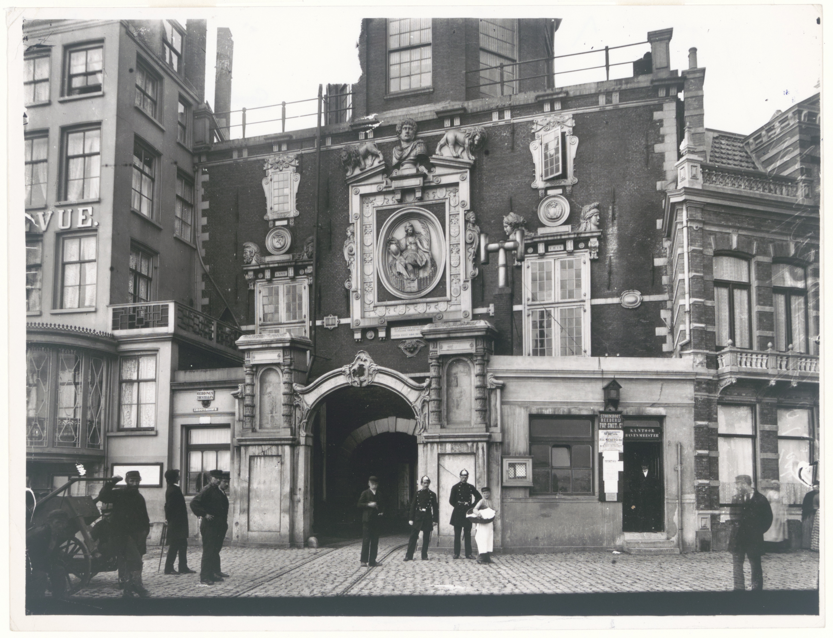 - Groothoofdspoort met kantoor van stoombootrederij Fop Smit. Links Hotel Bellevue. De rails zijn van de paardentram.