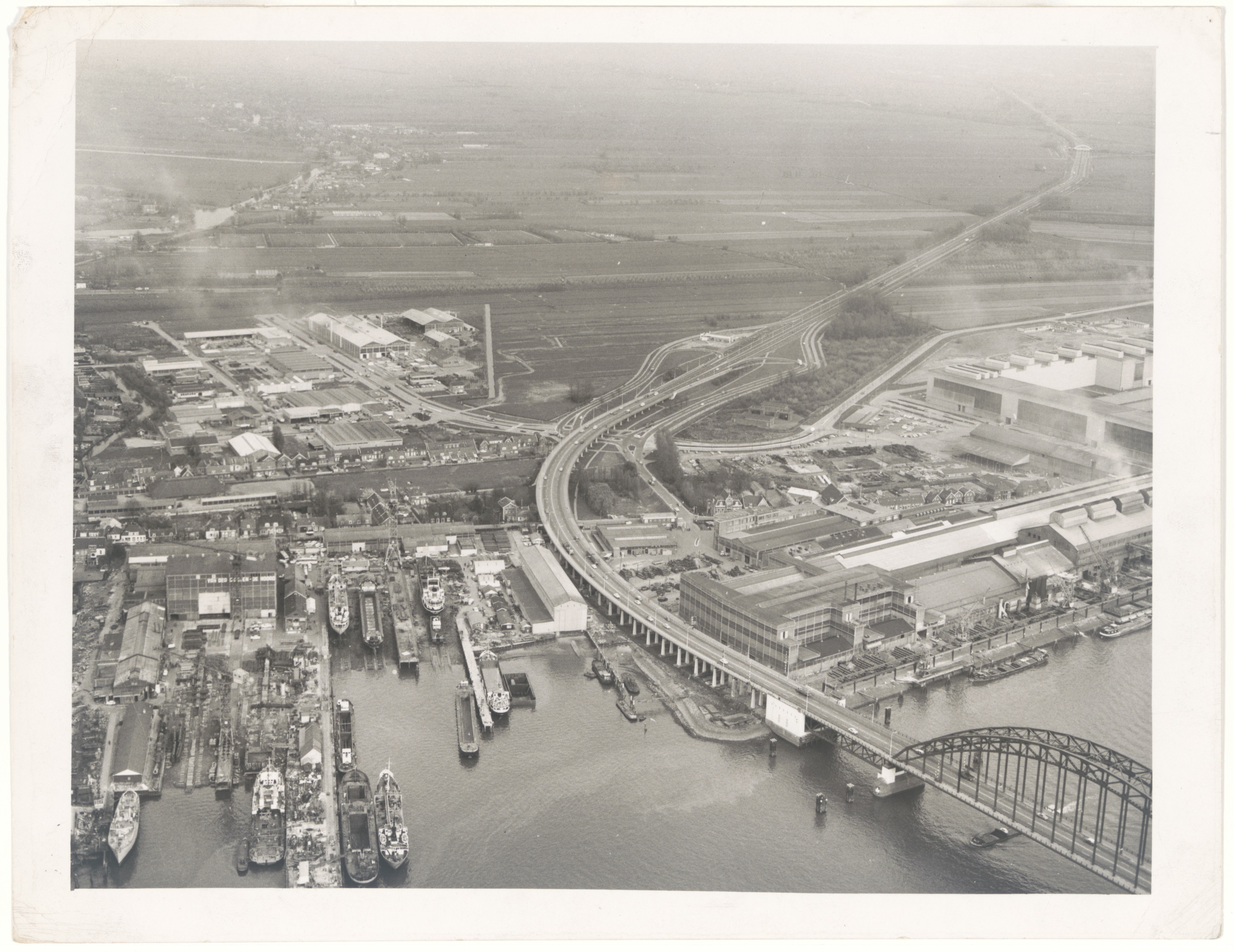 - autosnelwegen / rijkswegen fabrieken luchtfoto's scheepswerven verkeersbruggen vrachtboten