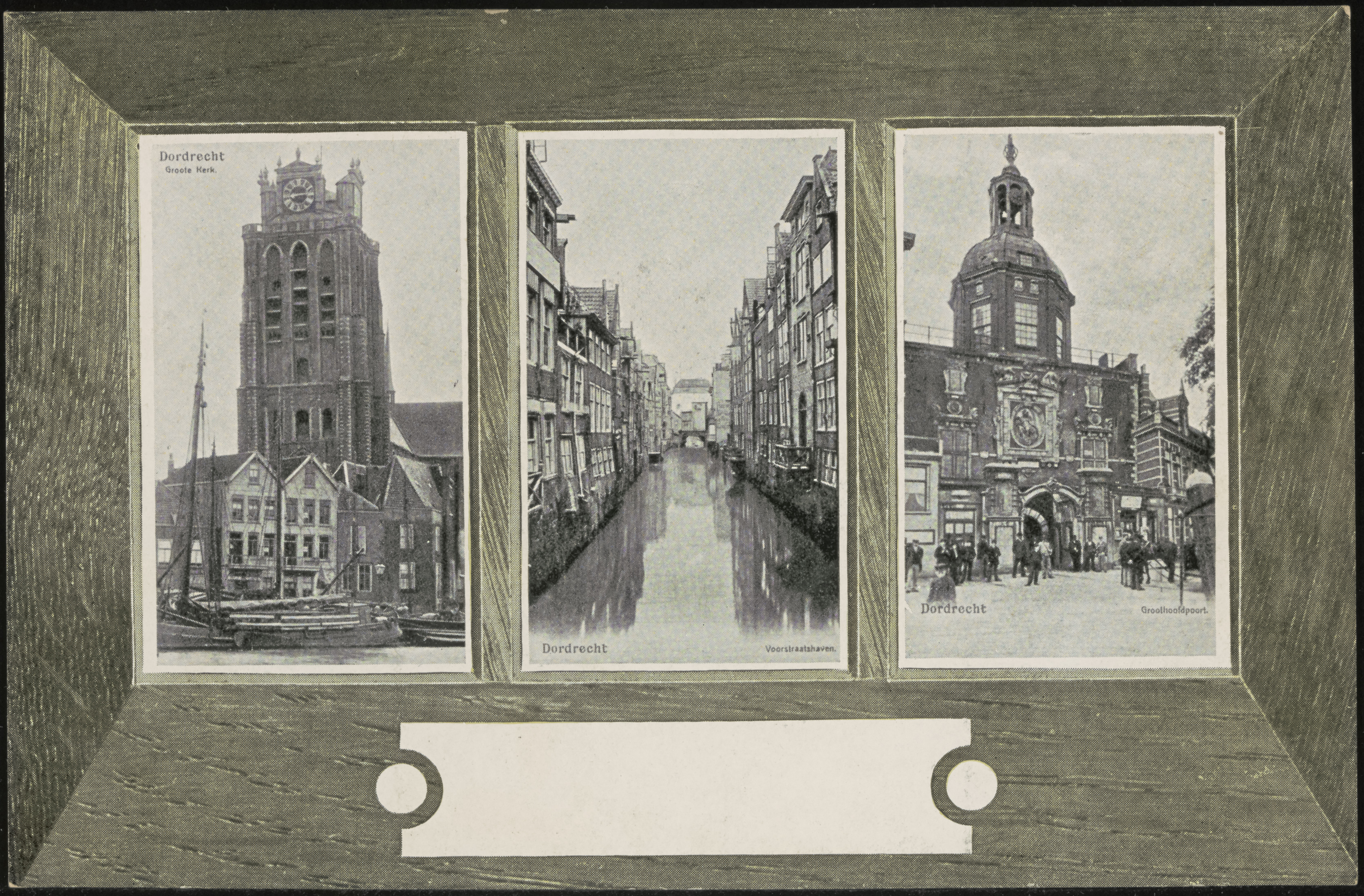 - Links: De Grote Kerk en huizen aan de Korte Geldersekade, gezien over de Bomhaven Midden: De Voorstraatshaven vanaf de Visbrug naar de Tolbrug. Links de Groenmarkt, rechts de Voorstraat. Rechts: De Groothoofdspoort aan de zijde van het Groothoofd.
