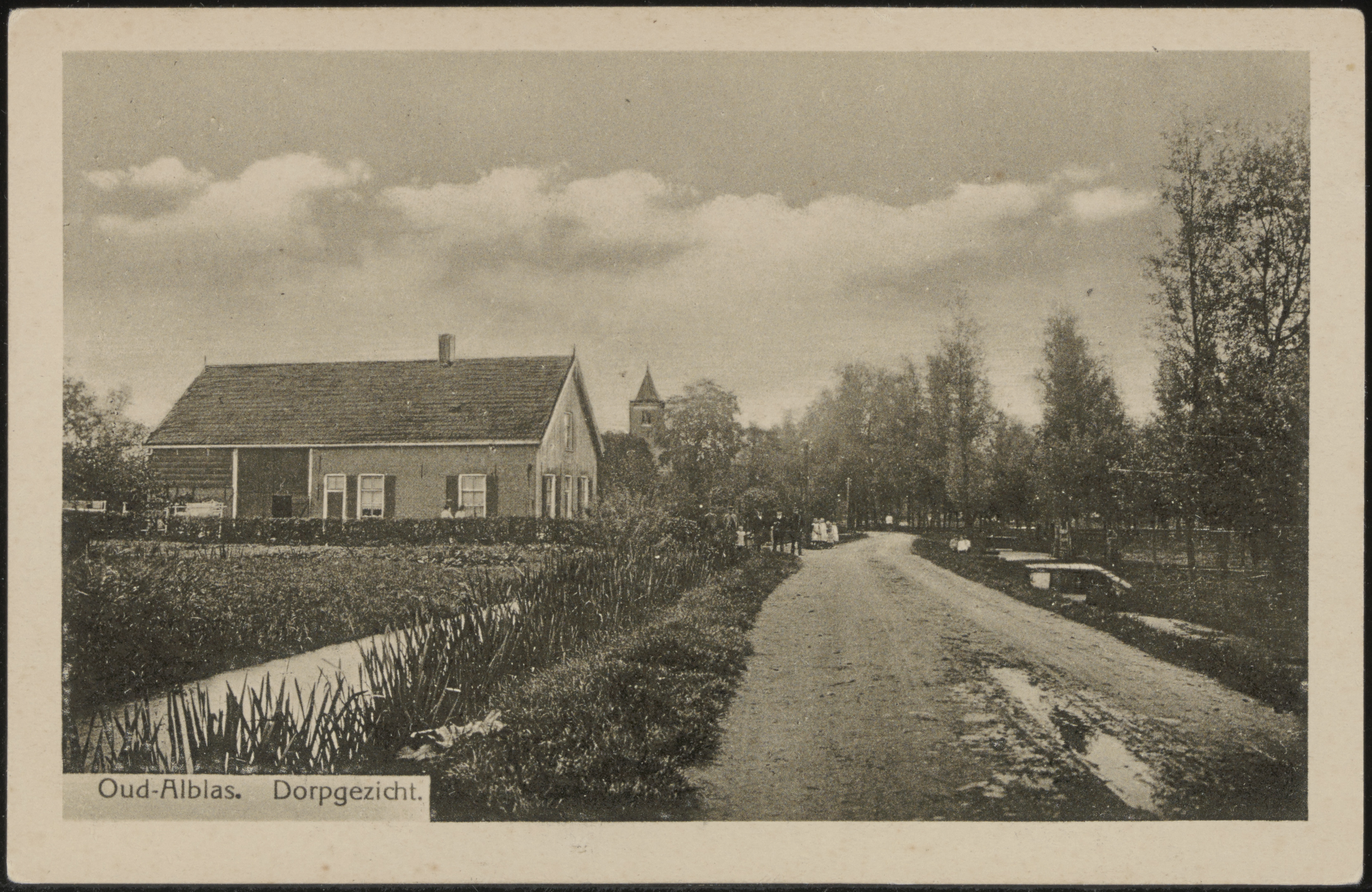 - De Dorpsstraat richting de Hervormde Kerk in Oud-Alblas met links de bestaande boerderij met (huidig) huisnummer 79