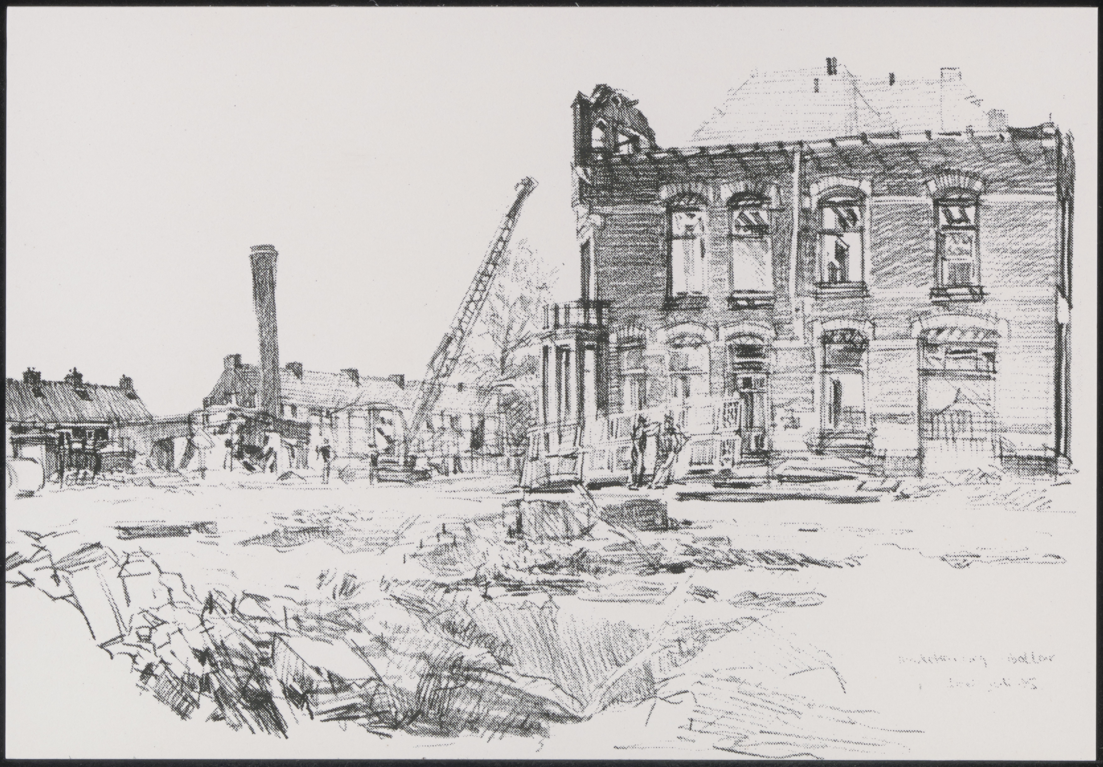 Tekening door Led Brand van de sloop van het abattoir aan de Markettenweg.