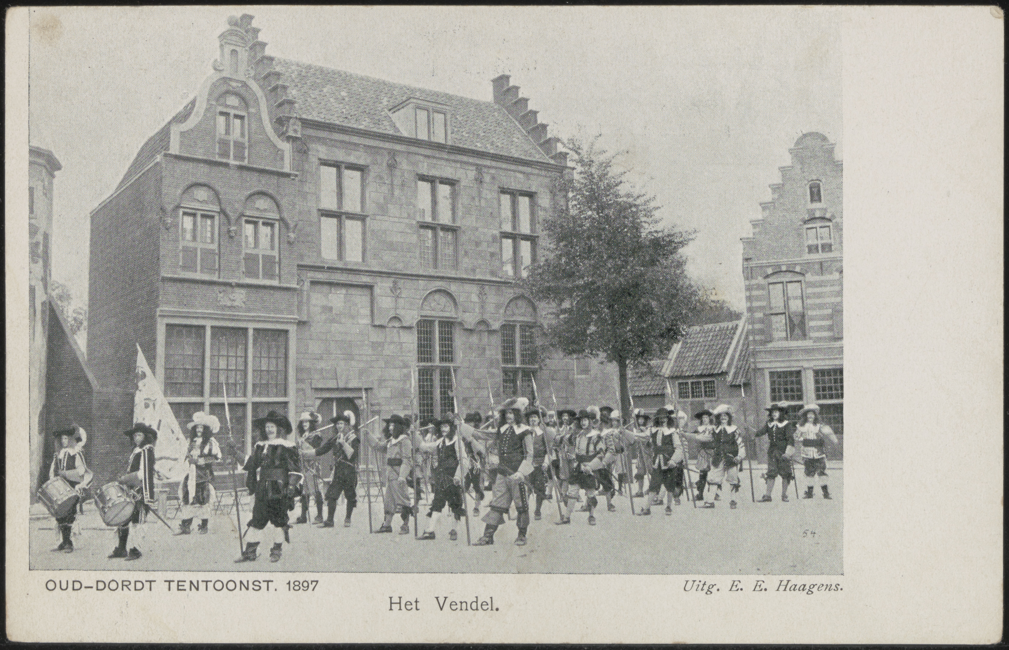 - Nijverheids- en kunsttentoonstelling Oud-Dordt met het vaandel van de schutterij voor de Kloveniersdoelen.