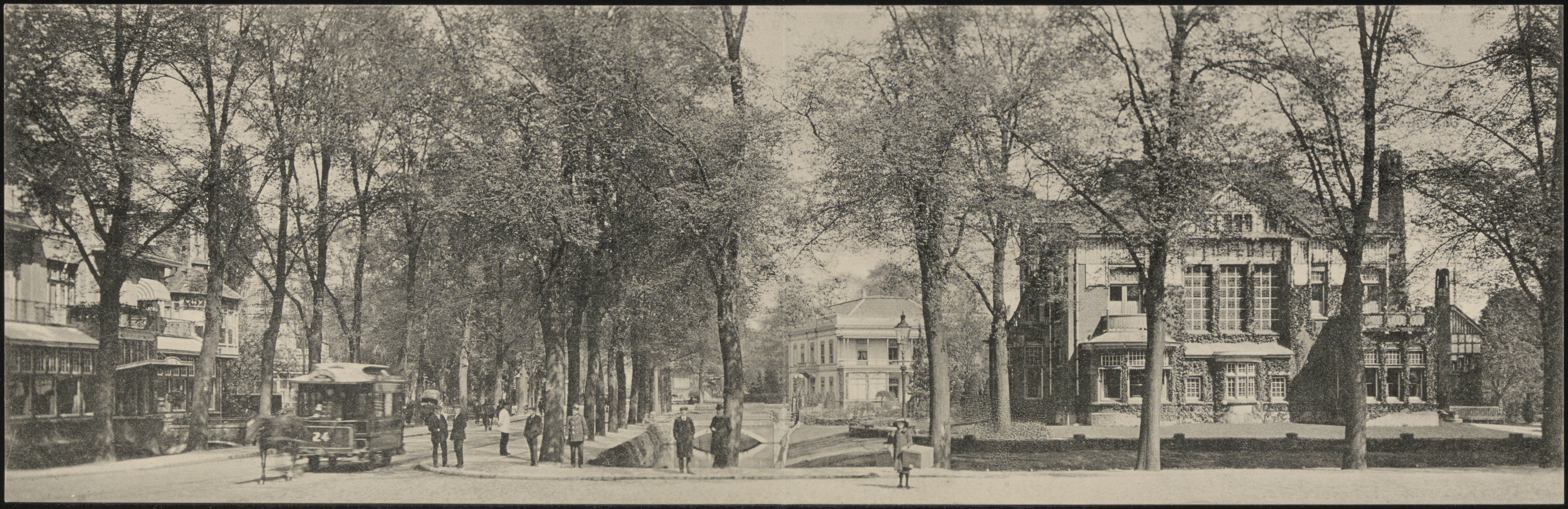 - Paardentram op de Stationsweg rijdt richting Burgemeester de Raadtsingel. Links hotel Ponsen, midden Huize Sint Anna en rechts villa Simpang.