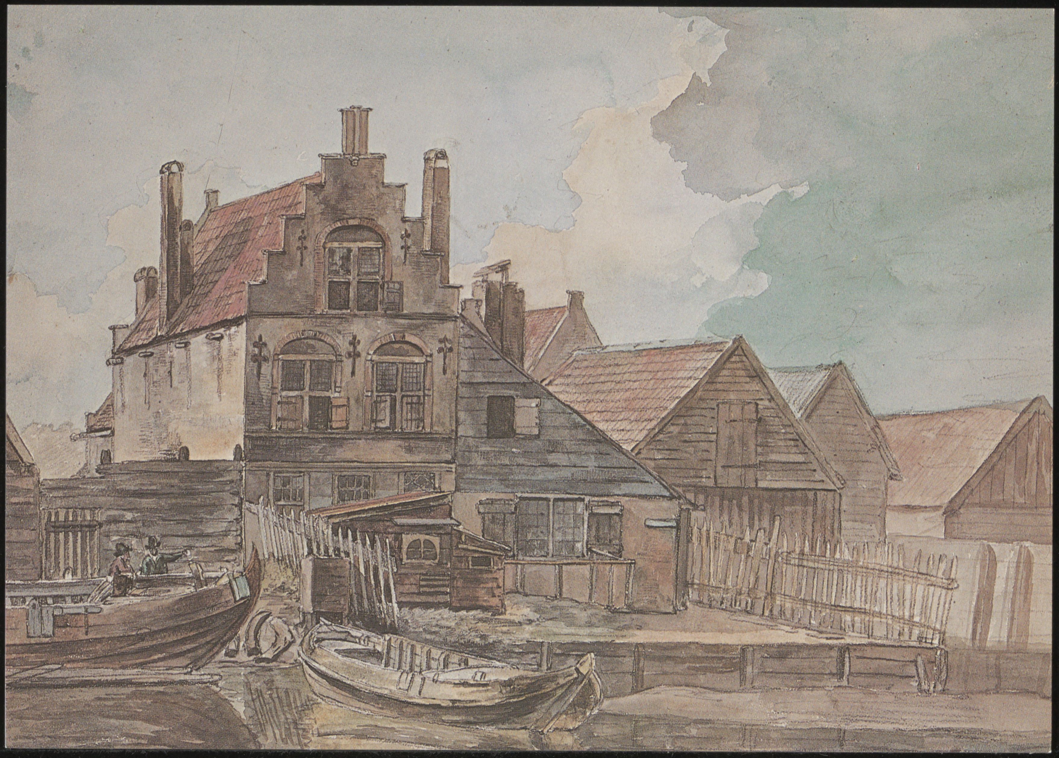 - Tekening van de Spuihaven met huizen en loodsen aan de Hellingen.