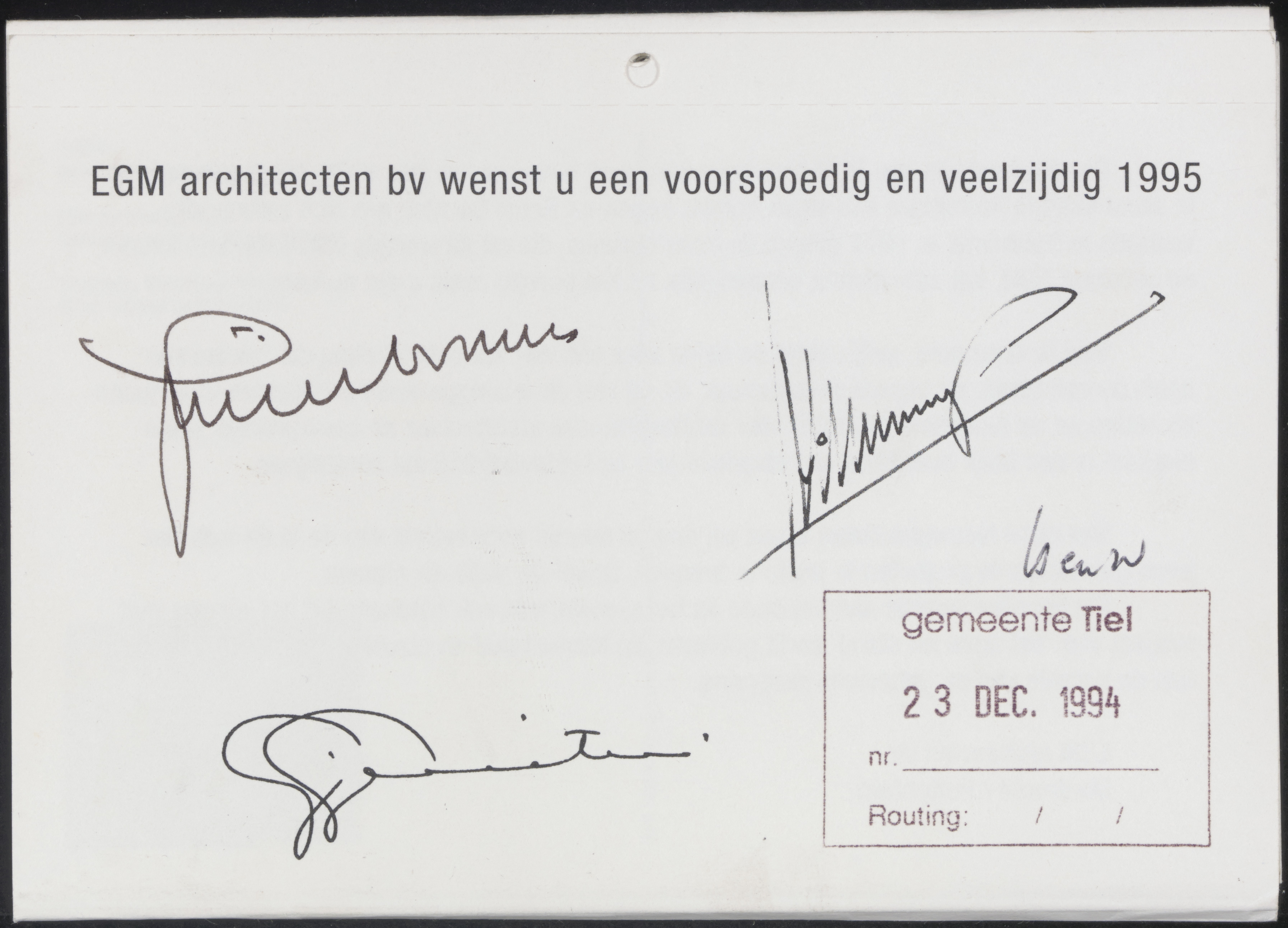 - Nieuwjaarskaart van architectenbureau EGM met de handtekeningen van de architecten Eijkelenboom, Gerritsen en Middelhoek.