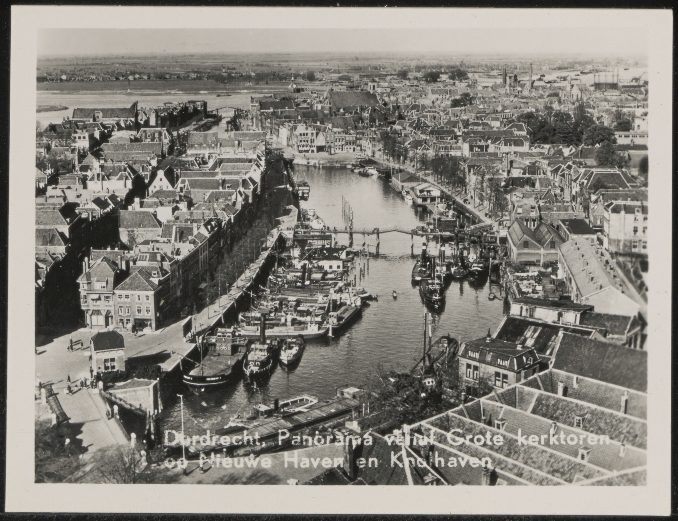 - Panorama vanaf de toren van de Grote Kerk op de Nieuwe Haven en Knolhaven met het botenhuis van de roei- en zeilvereniging (rechts)..