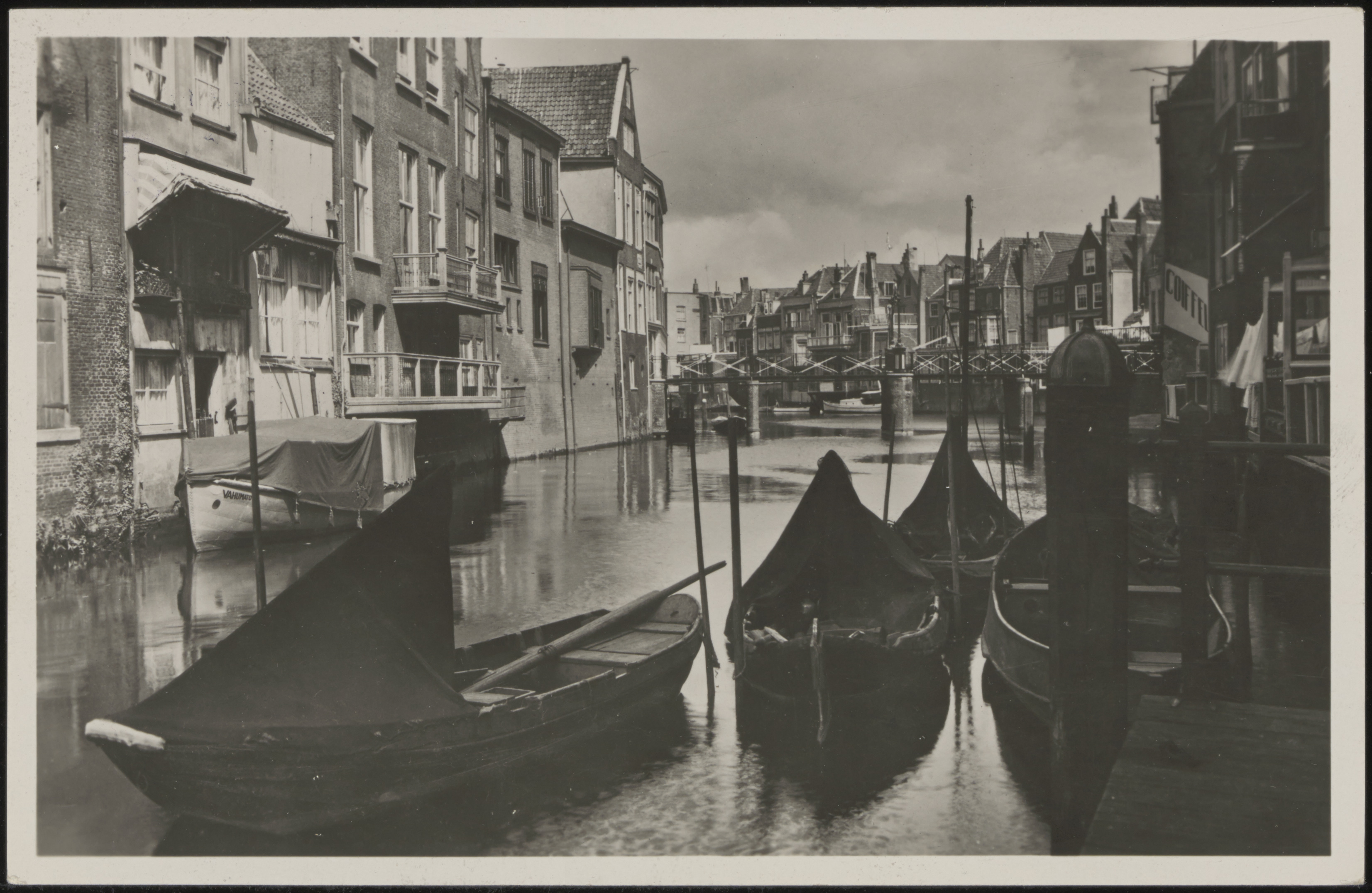 - De Voorstraatshaven vanaf het Scheffersplein richting Wijnbrug. Links de Wijnstraat, rechts de Voorstraat.