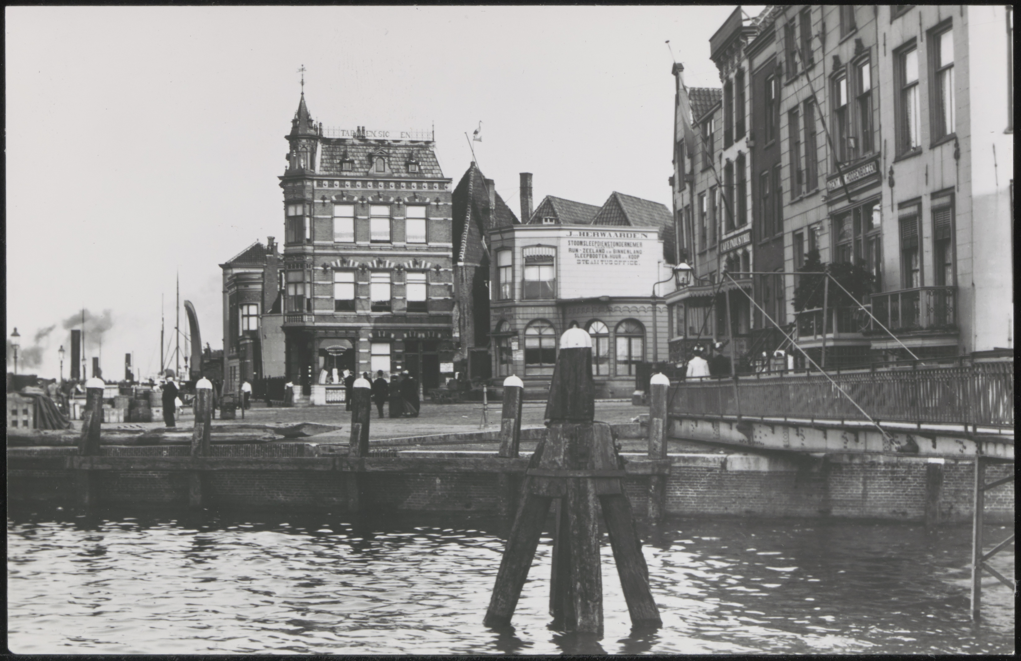 - Het pand links staat op de hoek van de Merwekade en het Bolwerk. Rechts de Kippenbrug over de monding van de Wijnhaven.