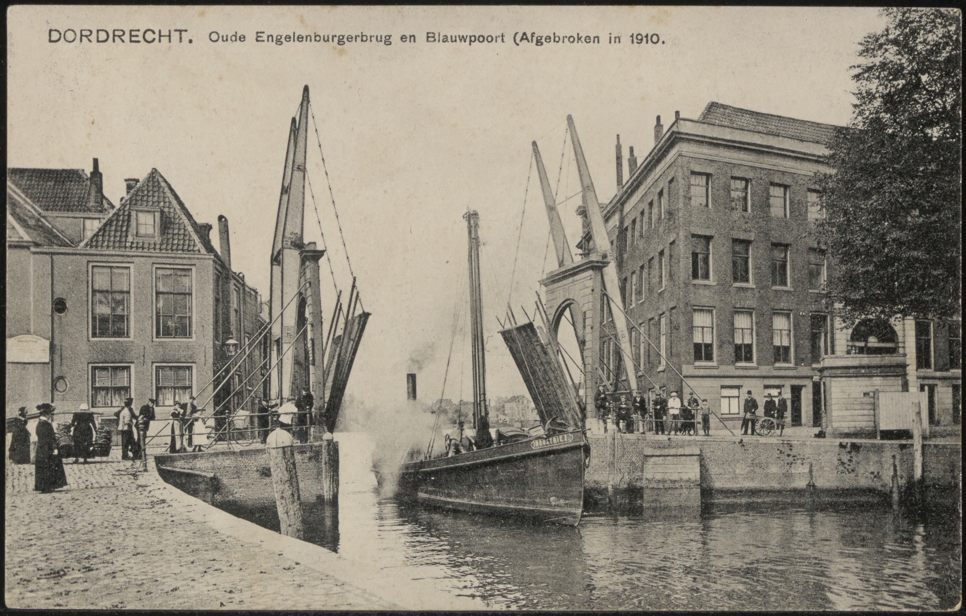 - Engelenburgerbrug over de Nieuwe Haven gezien vanaf de Houttuinen. Rechts de Blauwpoort.