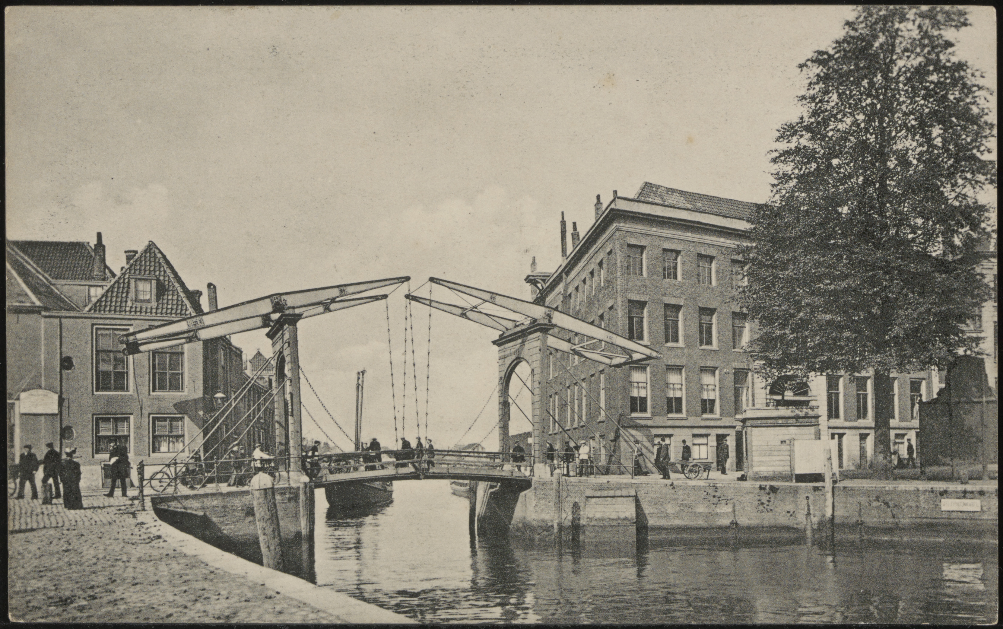- Engelenburgerbrug over de Nieuwe Haven gezien vanaf de Houttuinen. Rechts de Blauwpoort.
