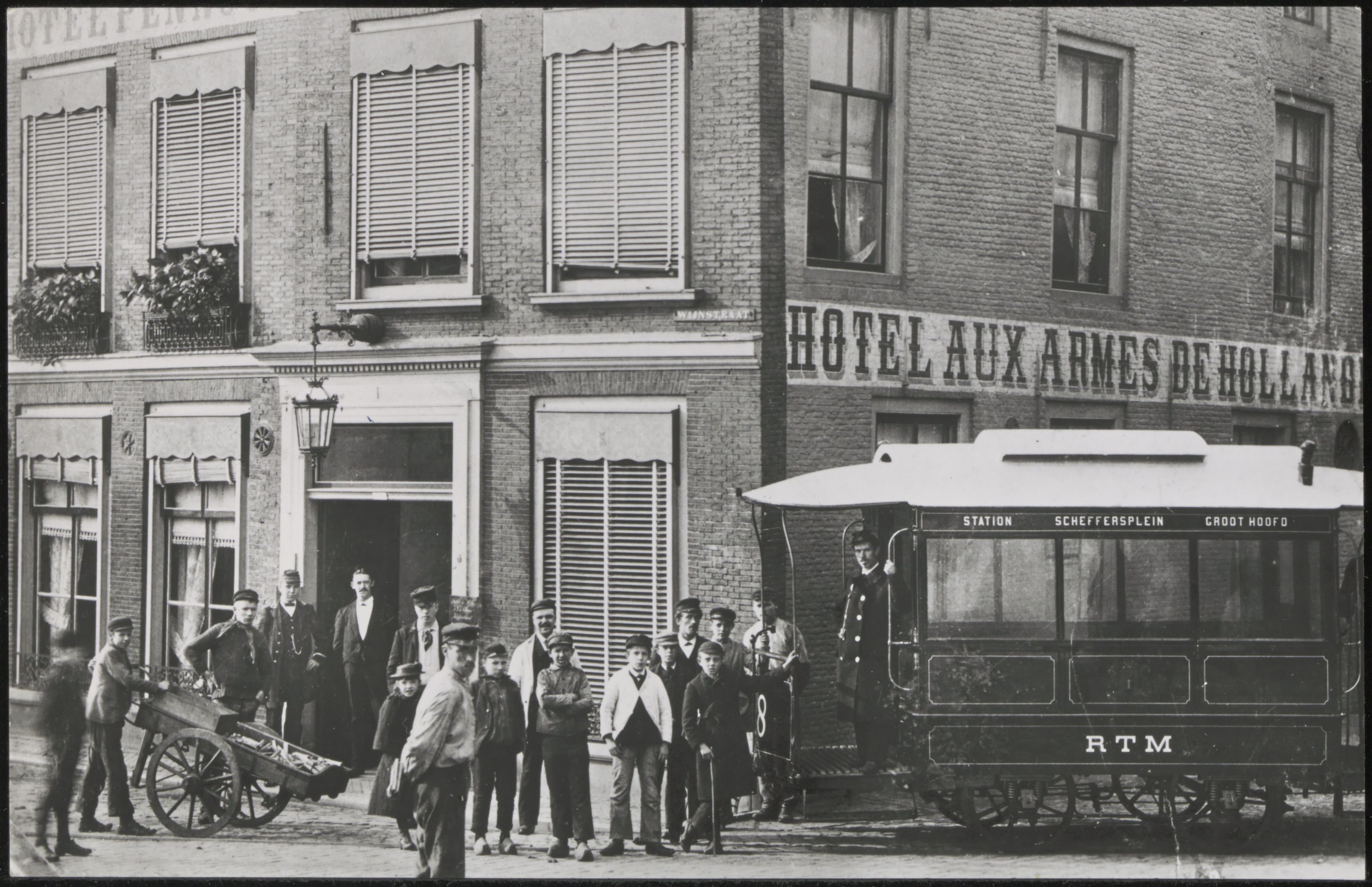 - Paardentram voor hotel Pennock op de hoek Wijnstraat / Palingstraat.