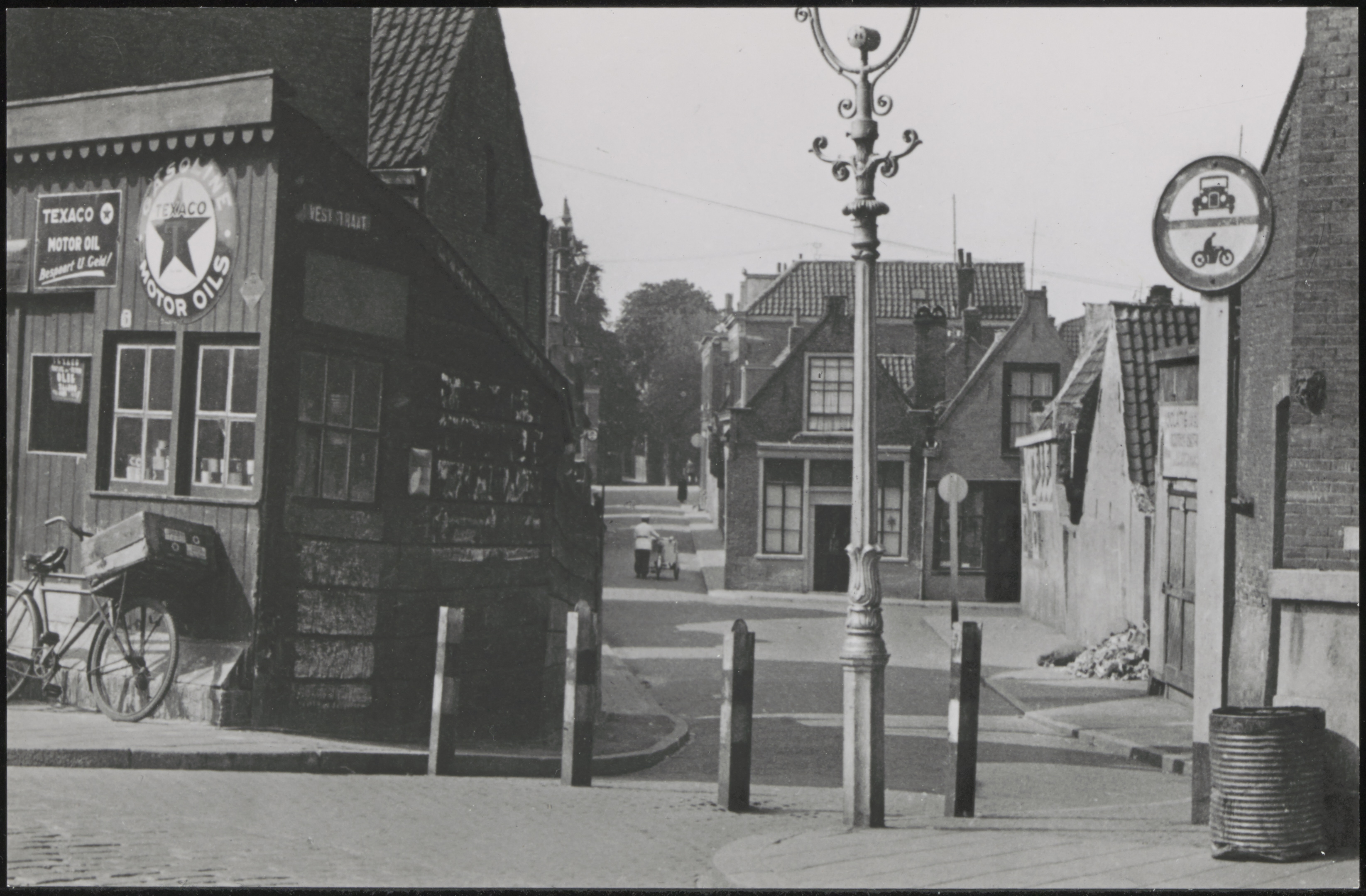 - Rijwielzaak en bezinepomphouder van J. de Roo op de hoek van de Vest (voorgrond) en de Veststraat.