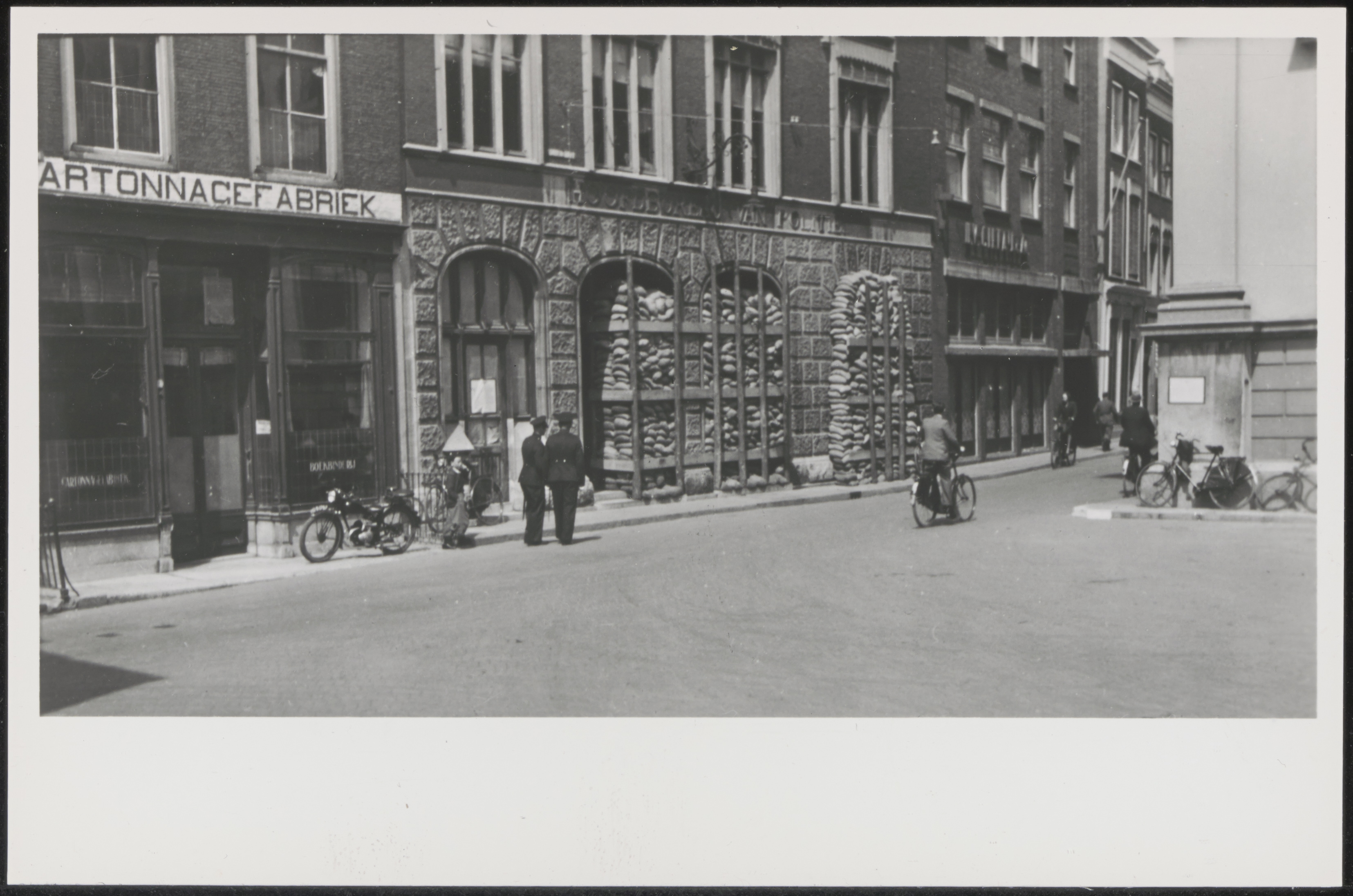 - Hoofdbureau van Politie op de Groenmarkt. De ramen zijn beveiligd met zandzakken (mei 1940).