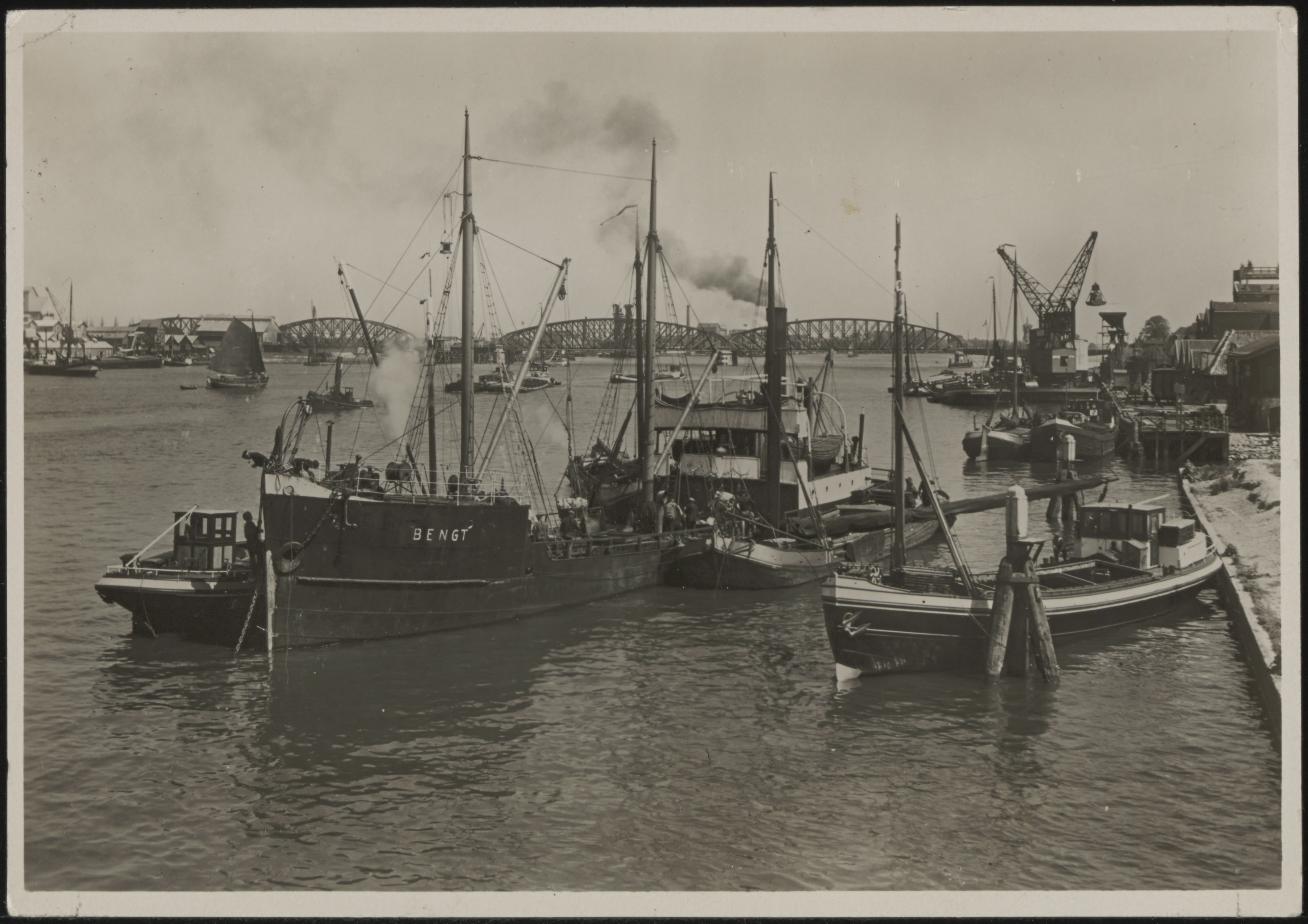 - Schepen op de Oude Maas t.h.v. de Handelskade, de spoorbrug op de achtergrond.