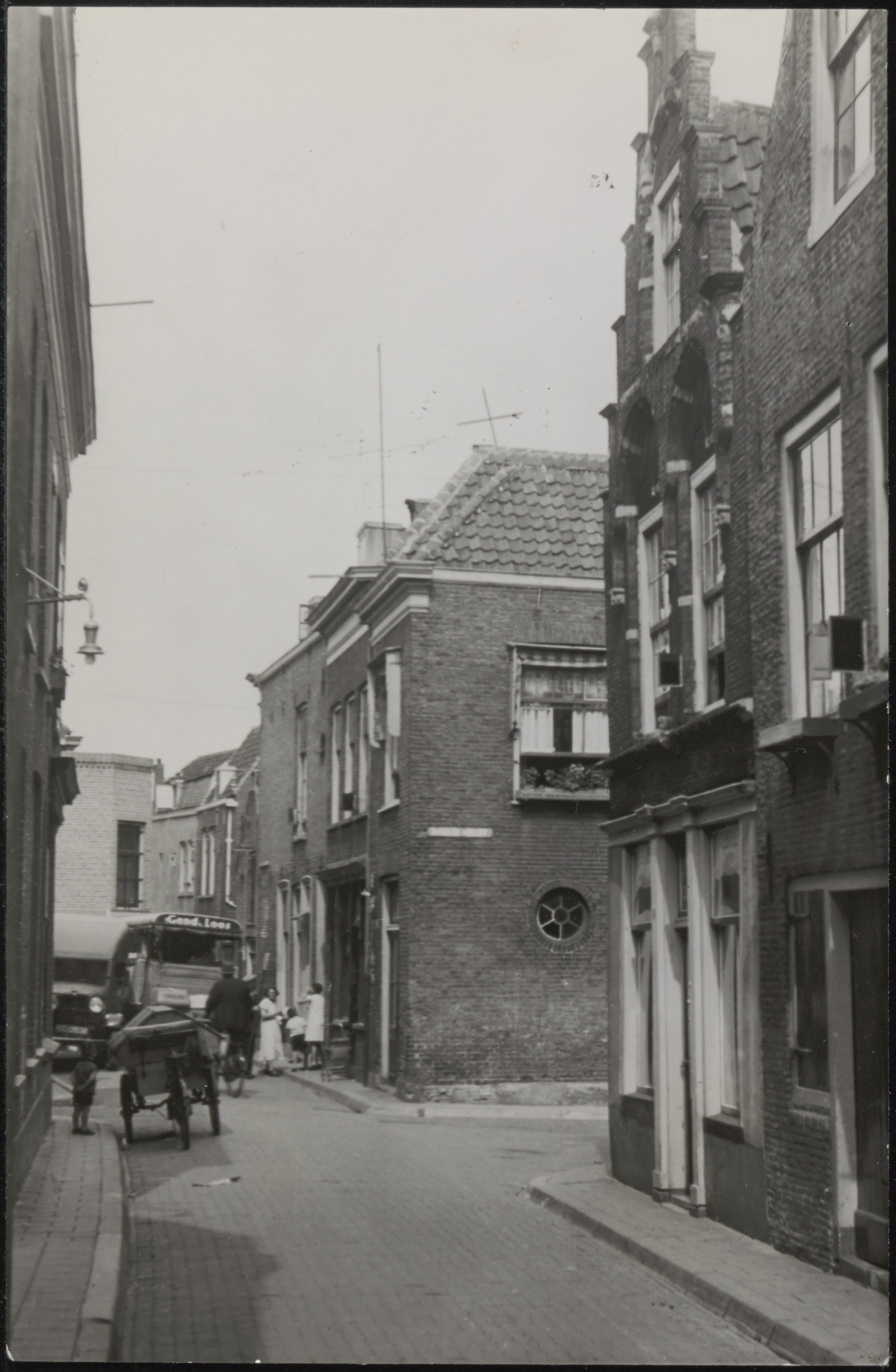 - De Blindeliedengasthuissteeg in de richting van de Nieuwe Lampetsteeg. Rechts de Gevulde Gracht. Op de achtergrond een wagen van Van Gend en Loos.