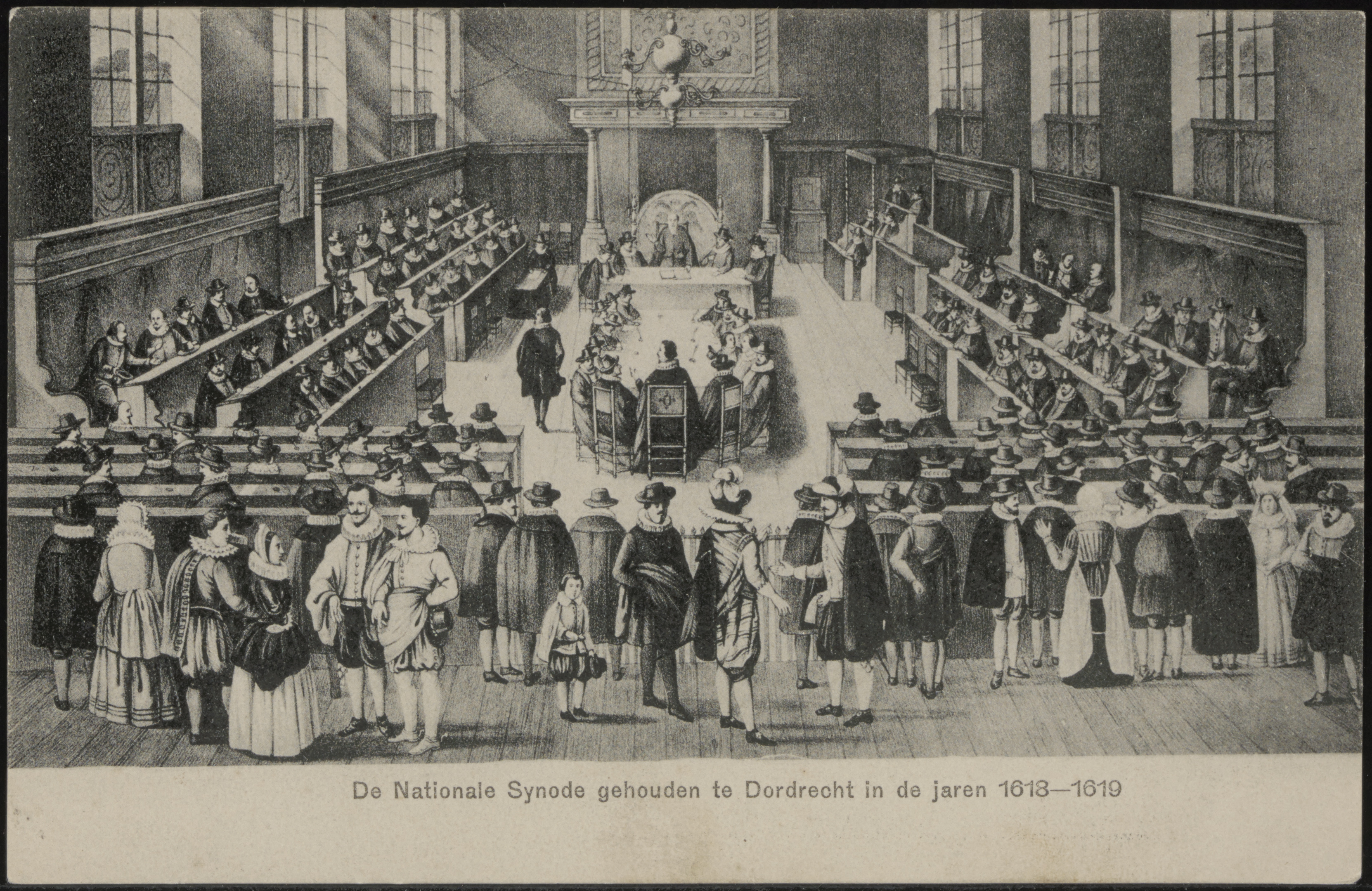- Schilderij door Pouwels Weyts van de bovenzaal van de Kloveniersdoelen waar de Nationale Synode werd gehouden in 1618/1619.