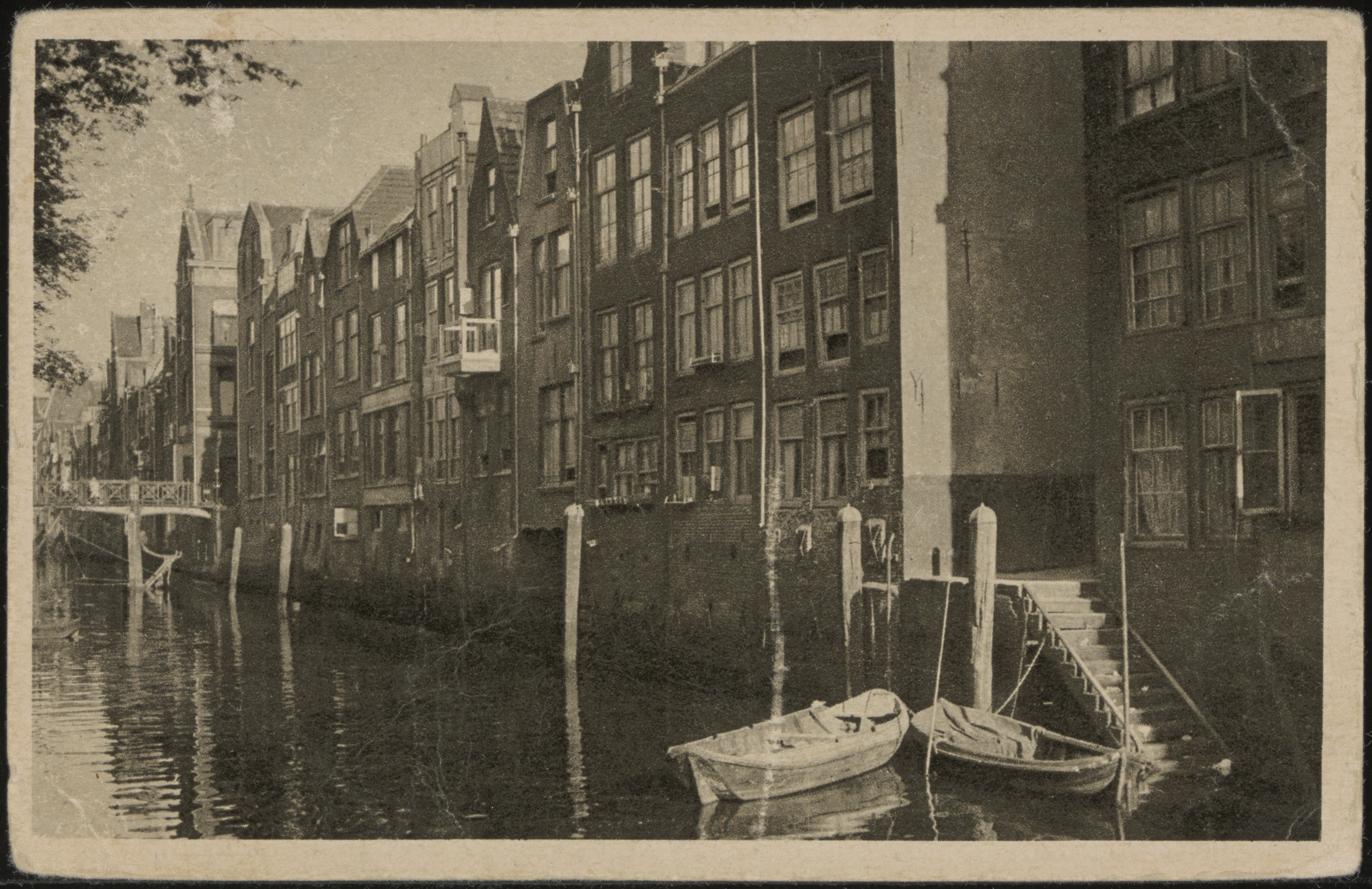 De Voorstraatshaven vanaf de Leuvebrug richting Pelserbrug. De huizen staan in de …