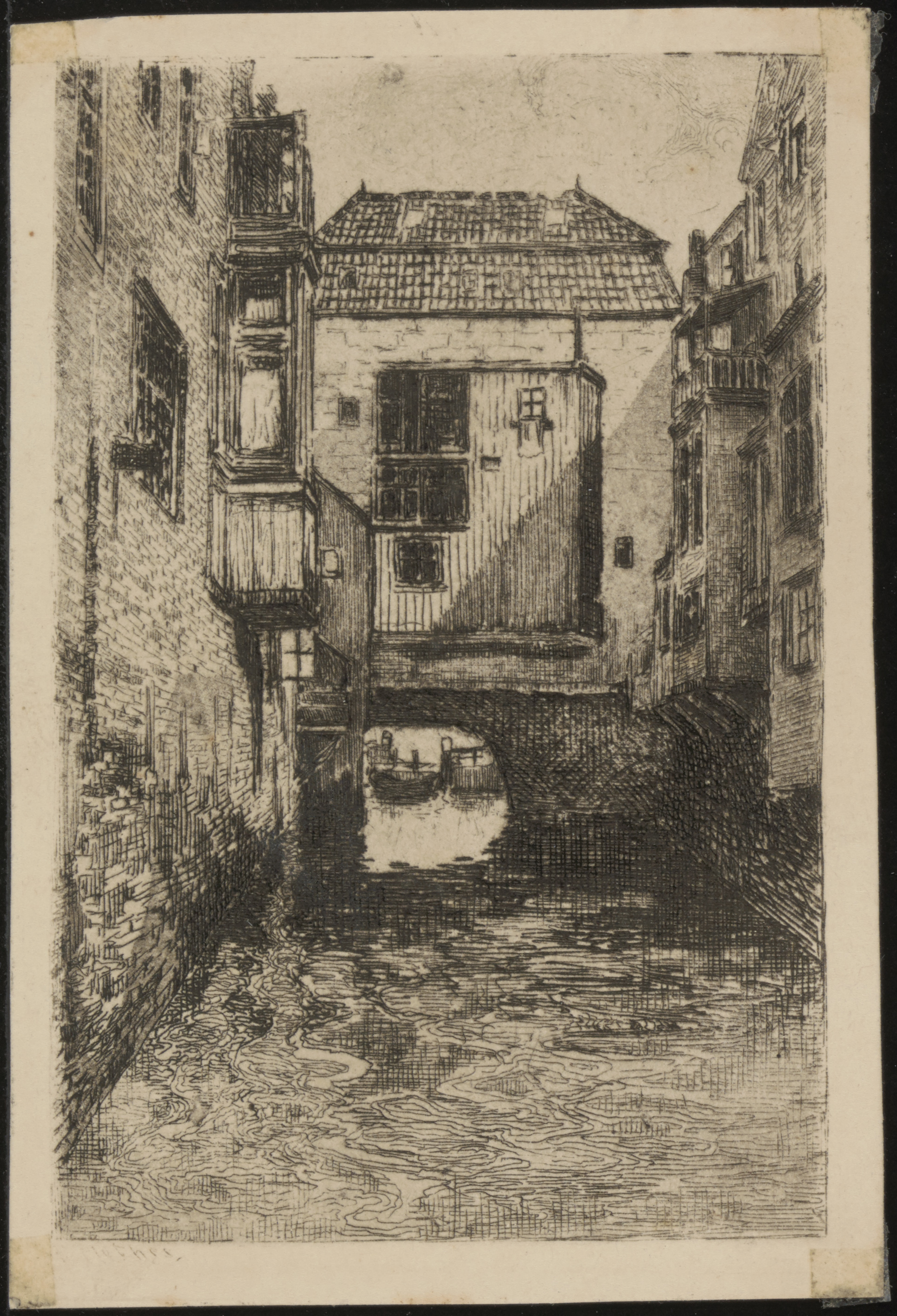 Tekening van de Voorstraatshaven, gezien van de Visbrug naar de Tolbrug. Links de …